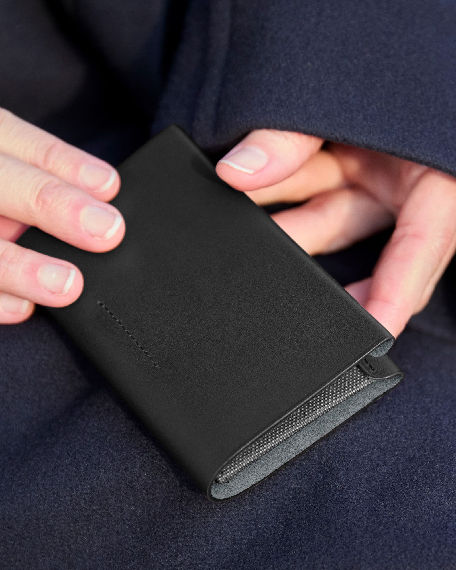 表の革とポケットは一部が縫い合わせてあるので、ポケットの前後をつまめば口が大きく開き、カードが出し入れしやすくなります。