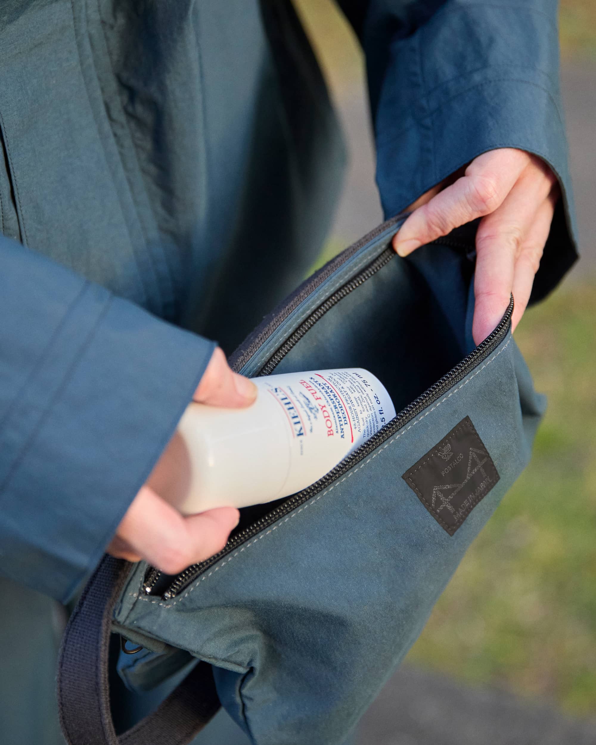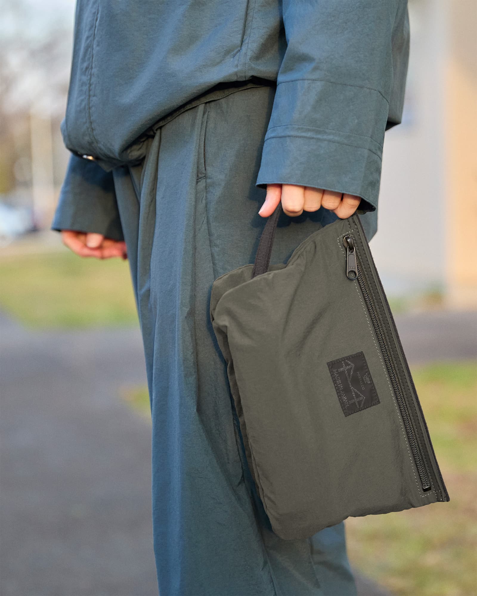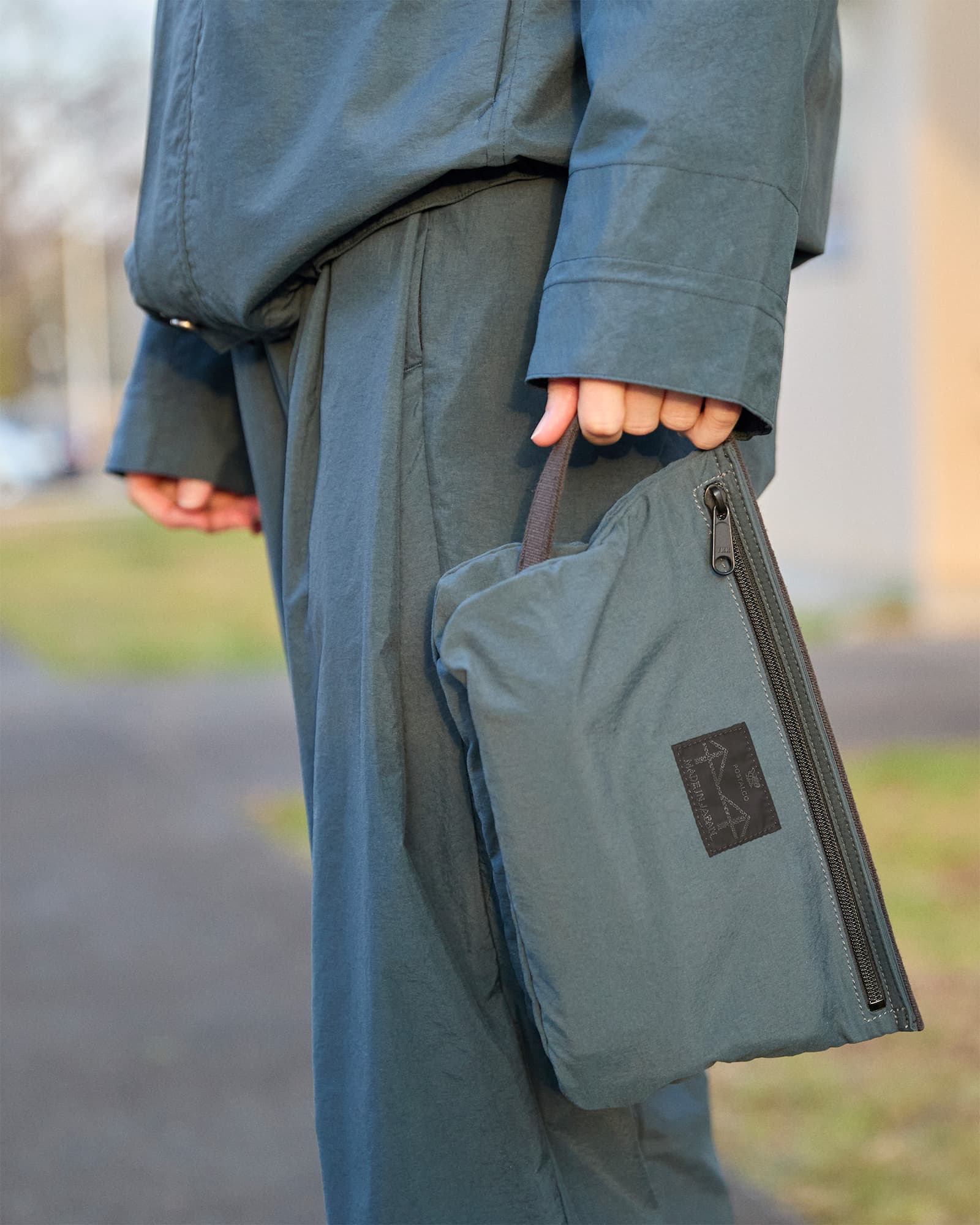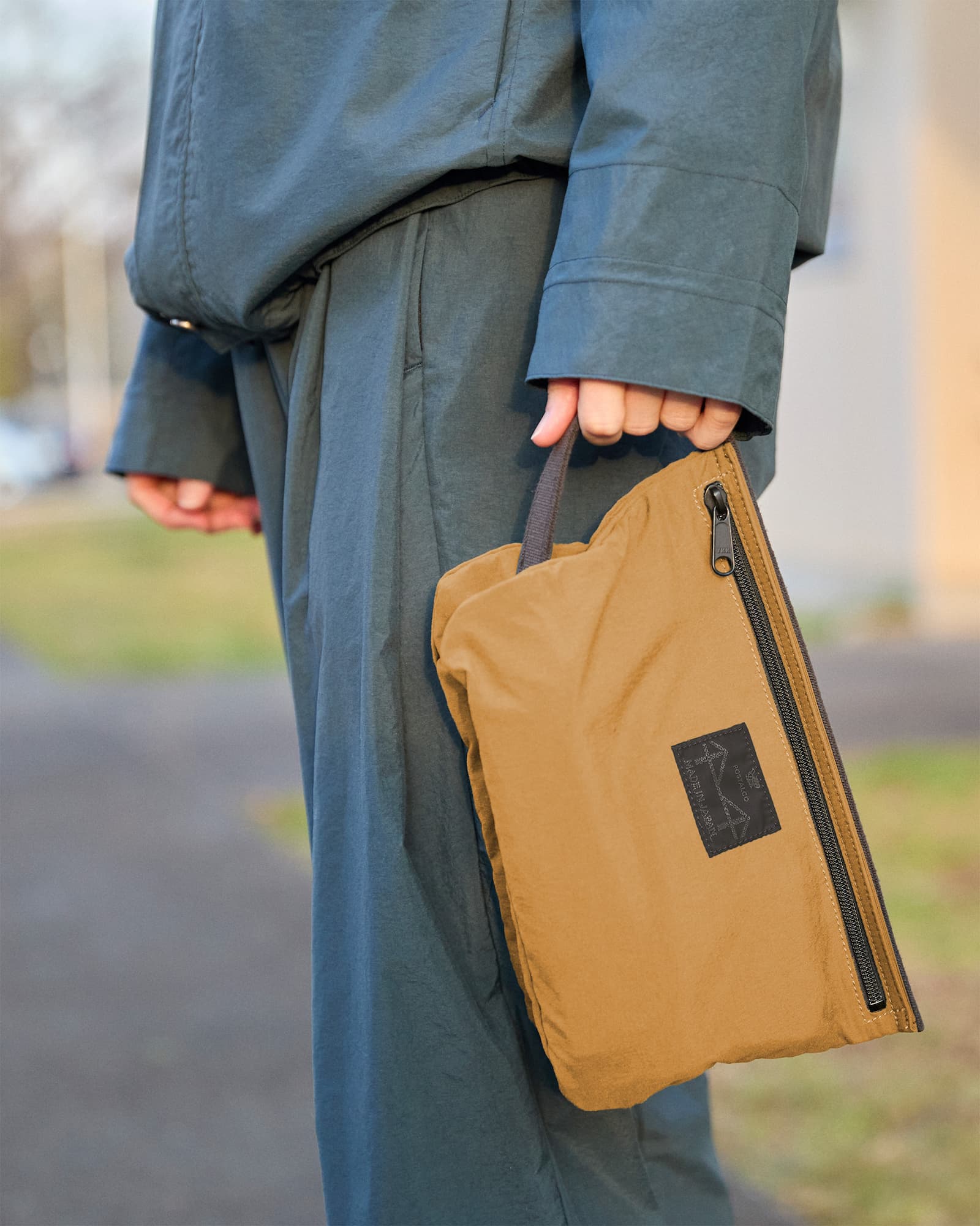 ポーチ部分は、ポスタルコのレインウェアに使われているオリジナルの撥水素材の二重仕立てで、固いストラップで繋がれています。洗面用具入れに最適だけど、文具類やケーブル入れにも。ナイロン製で洗濯可。