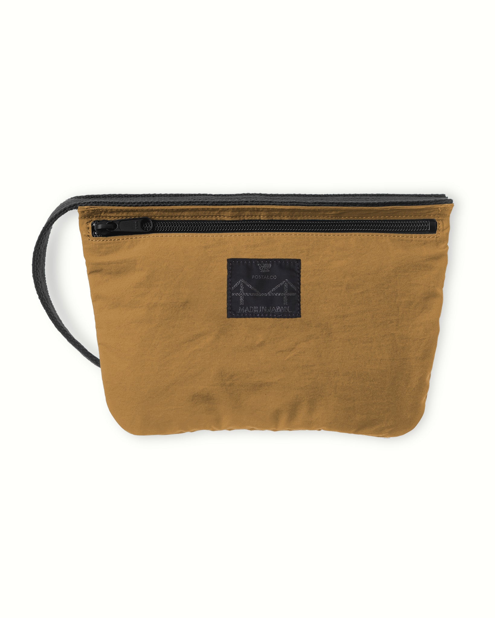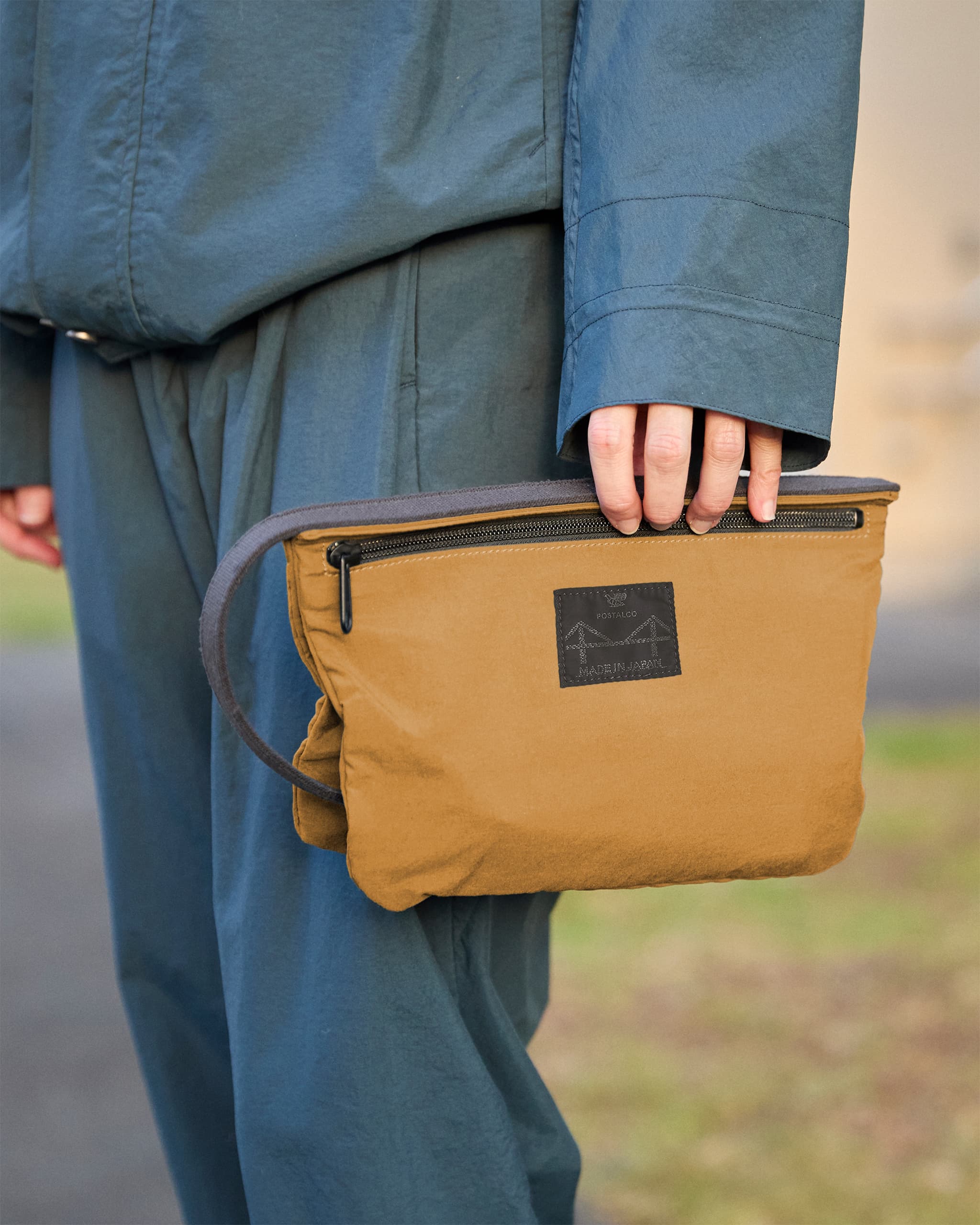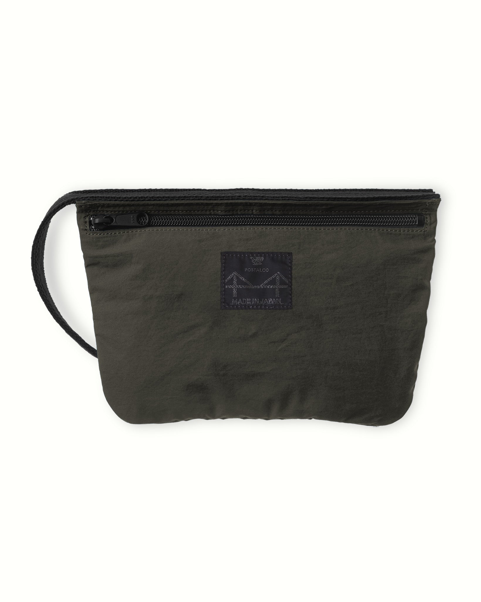 ポーチ部分は、ポスタルコのレインウェアに使われているオリジナルの撥水素材の二重仕立てで、固いストラップで繋がれています。洗面用具入れに最適だけど、文具類やケーブル入れにも。ナイロン製で洗濯可。日本製。