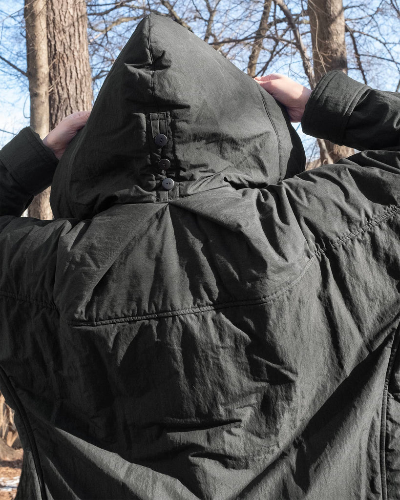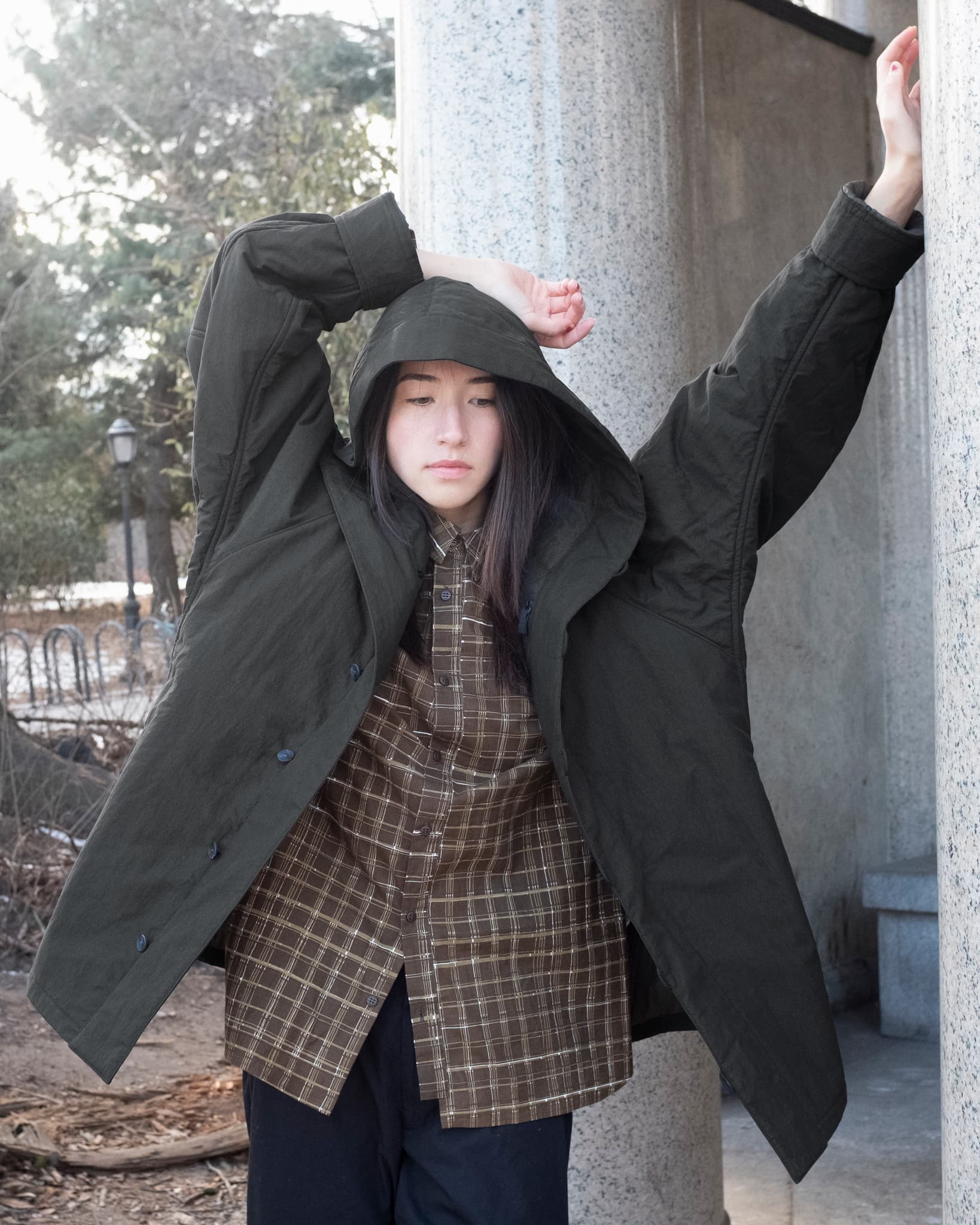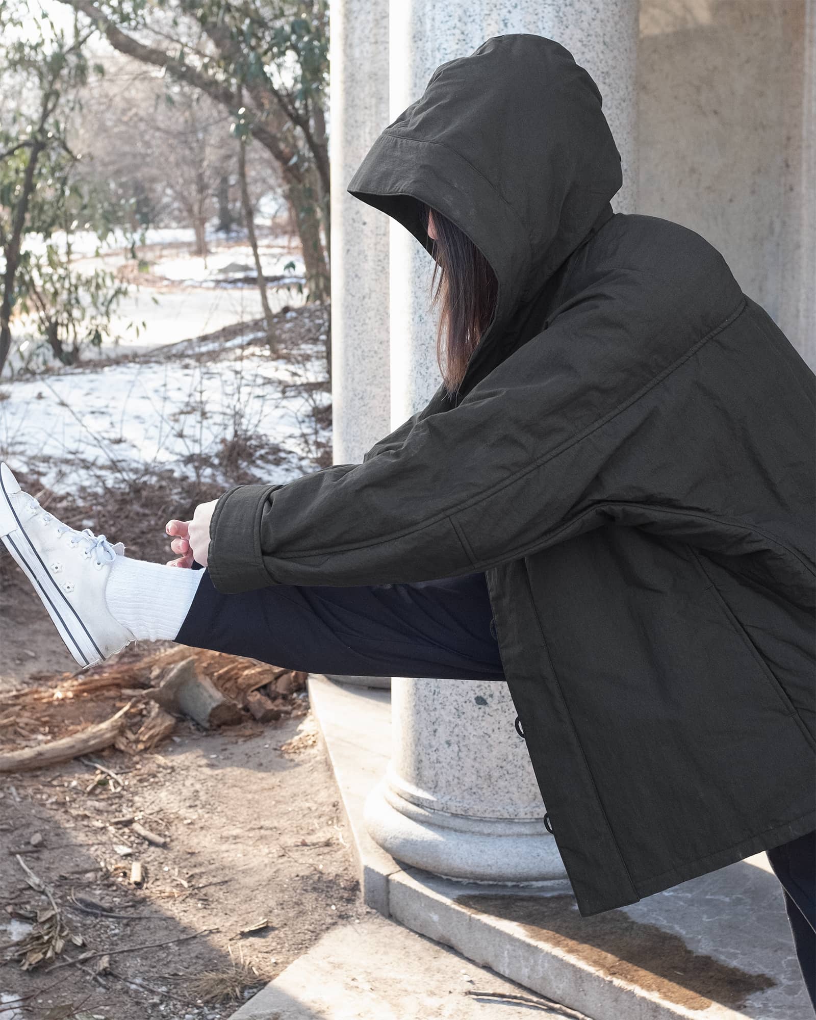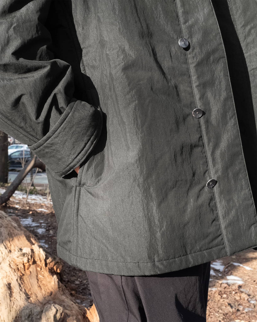 動きやすく、心地よい、可動領域の広い構造のジャケットです。これなら、服に動きを制限されません。ユニセックスです。着まわしができて、流行に関係のない定番アイテムです。ボクシングローブから着想を得ました。内ポケットには、携帯電話や小物を入れられます。サイドにハンドウォーマーポケット。撥水性のリップルファブリック。着心地のいいソフトなウールの中綿入り。日本製。