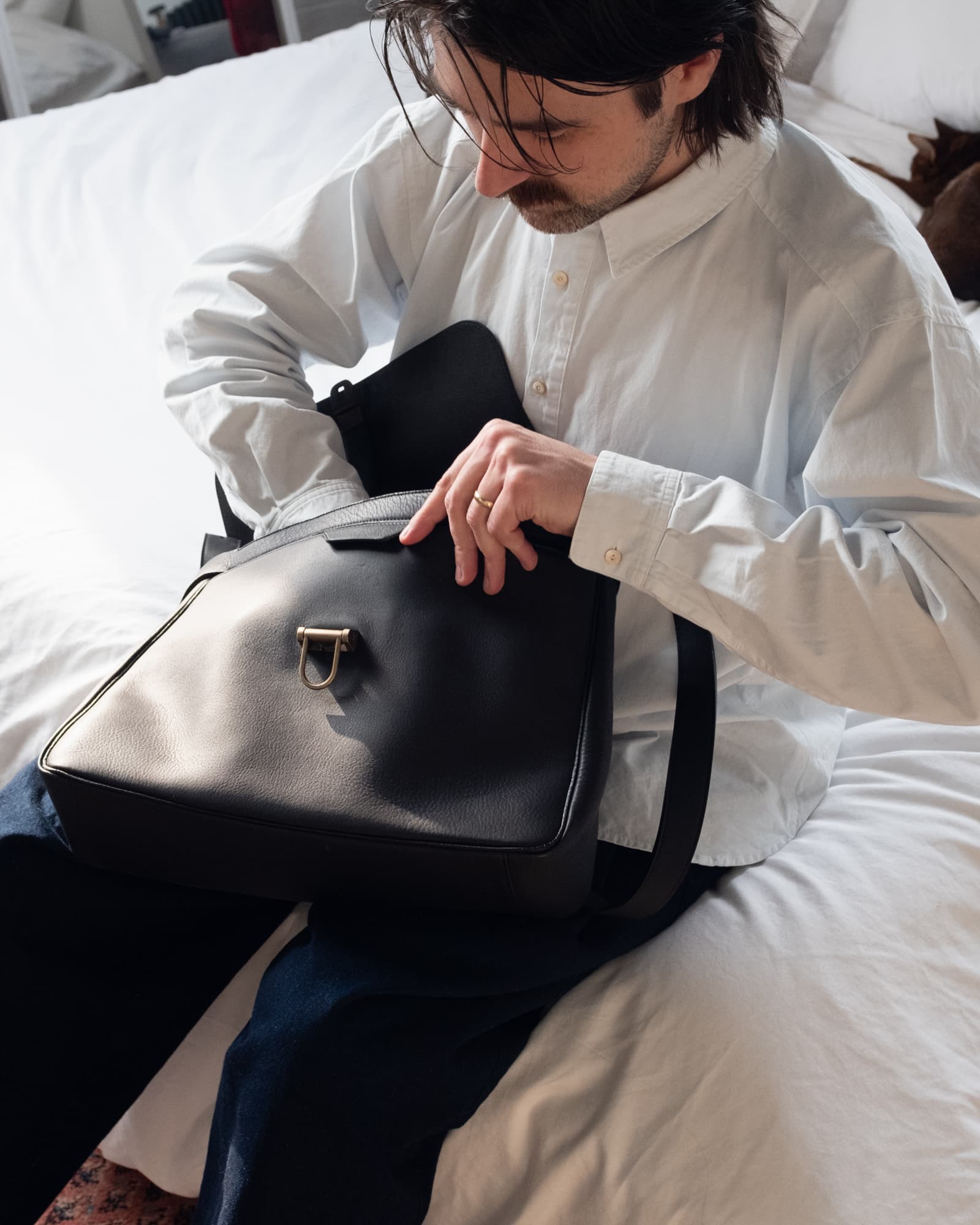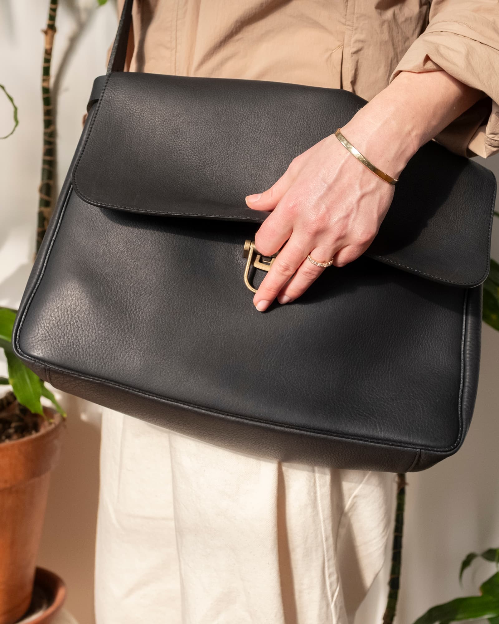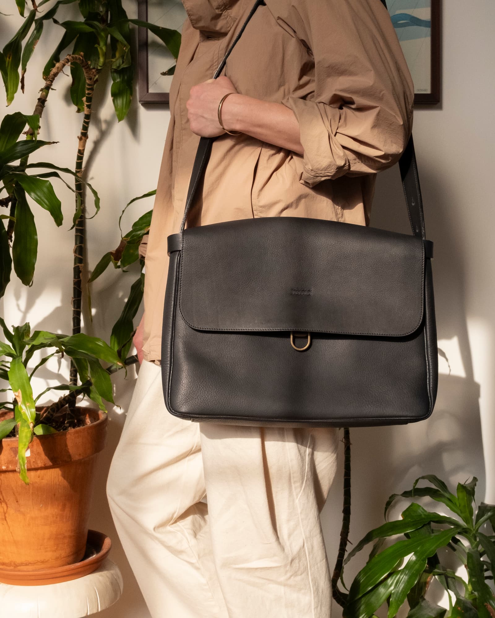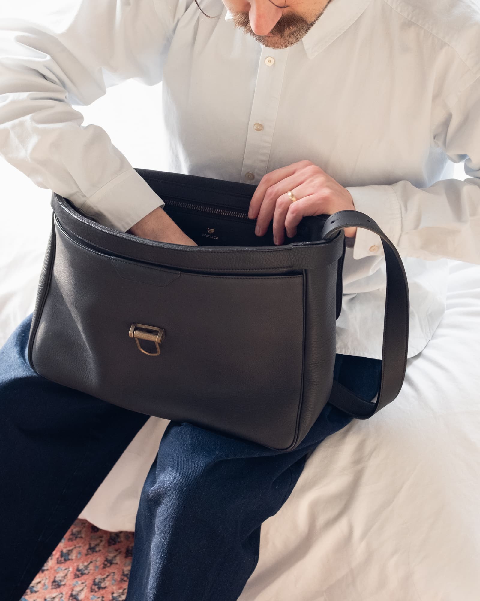 たいせつな手紙を配達してくれたポストマン。その肩にかかっていたのがメールバッグでした。前面と背面にオープンポケット。ミルレザーとピッグスキンの裏地。柔らかな手触りで、はじめから体にフィットします。A4サイズの書類がゆったり入り、16インチの Mac Book Pro も入れる事ができます。日本製。