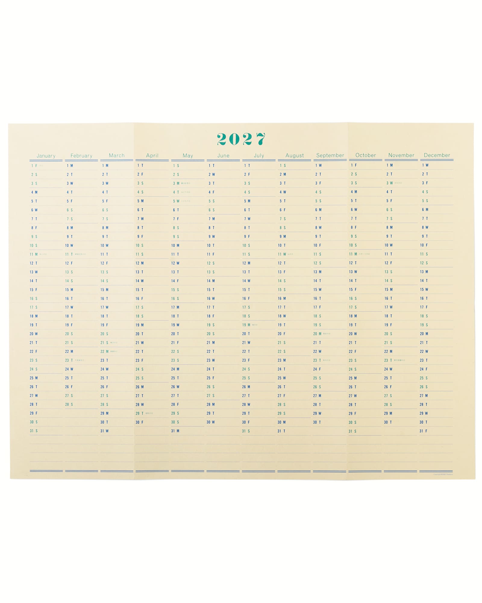 Make time visible. Instead of chopping up time into months or weeks, this calendar shows the larger flow of time in a year. Stepping back to see a whole year at once is ideal for planning projects, travel, or even keeping track of special days. Once time is visible it's possible to actually use time the way we like, instead of saying, "There goes another year!" Put a calendar up on the wall, instead of closing it up in a computer or phone, and people will naturally share and coordinate their plans. The One Year Wall Calendar has just enough space to write a brief note for each day. Blends in at the office or at home. Happy planning! All Japanese holidays shown.