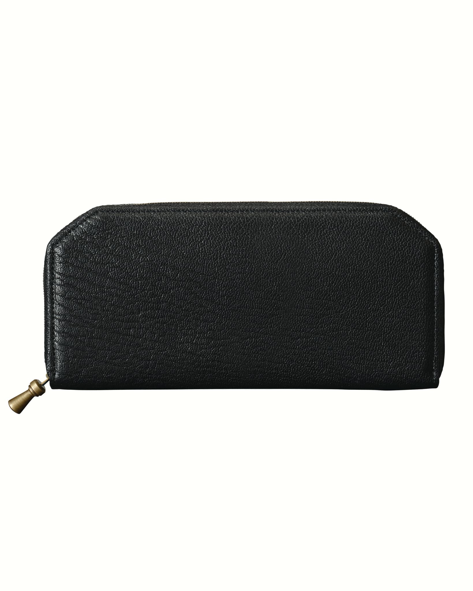 Open it and it's like a tiny collapsible file cabinet. Cut corners give it a balanced and rounded feeling in the hand. Geology Goatskin with calfskin and pigskin lining. Handmade in Japan.