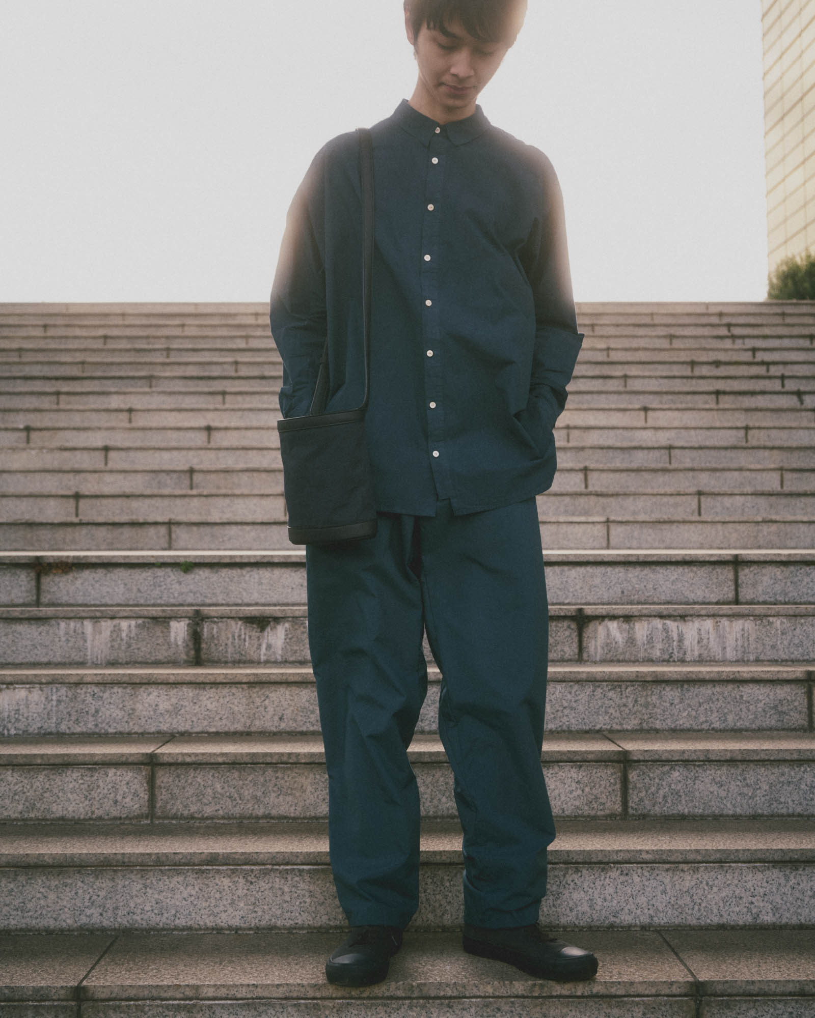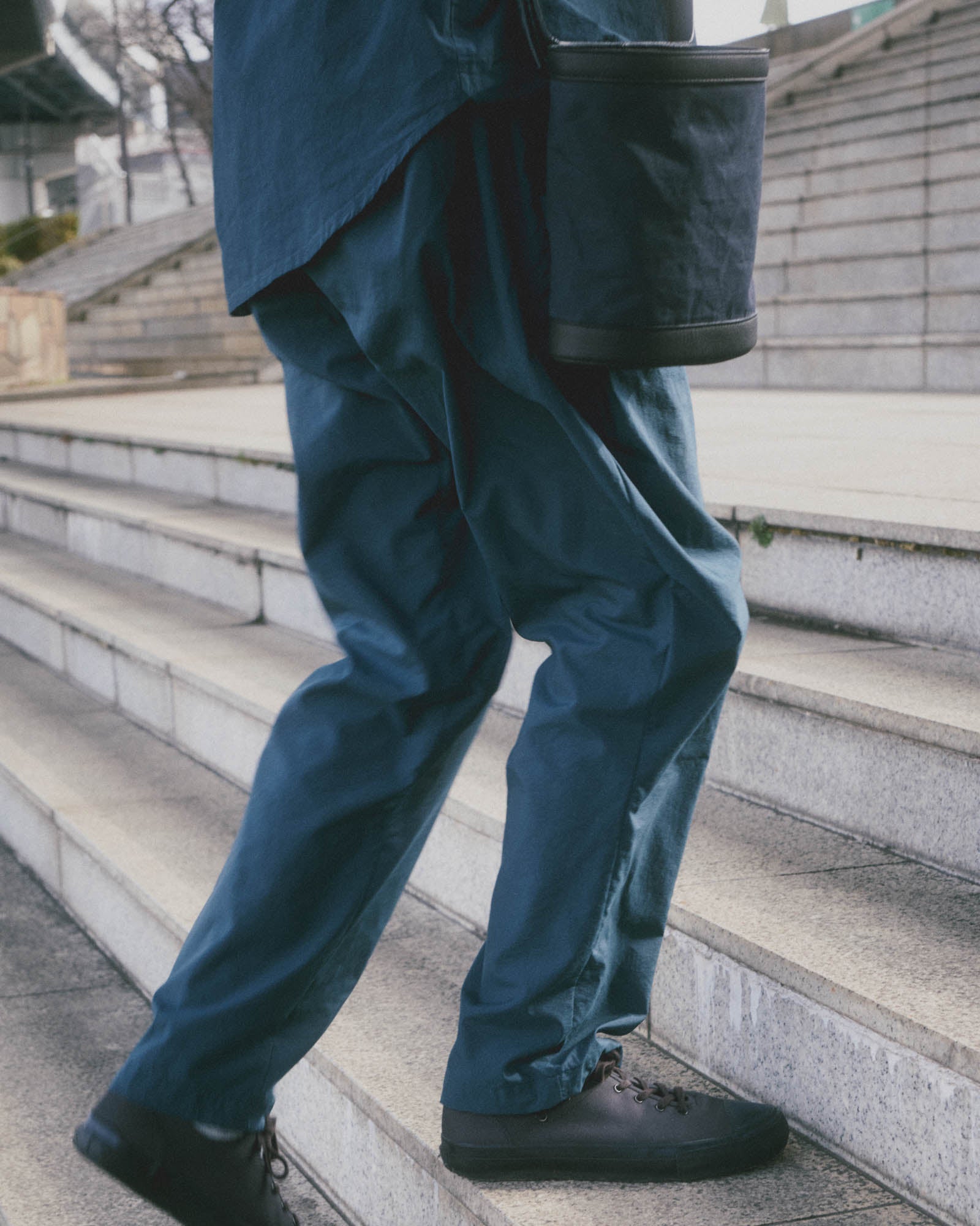 In typical pants every time you take a large step or pedal a bicycle, your leg is held back. You can’t move smoothly. In the Step Pant we engineered a deep pleat on the front that expands when the leg is lifted. When you are standing straight the pants drape down cleanly.