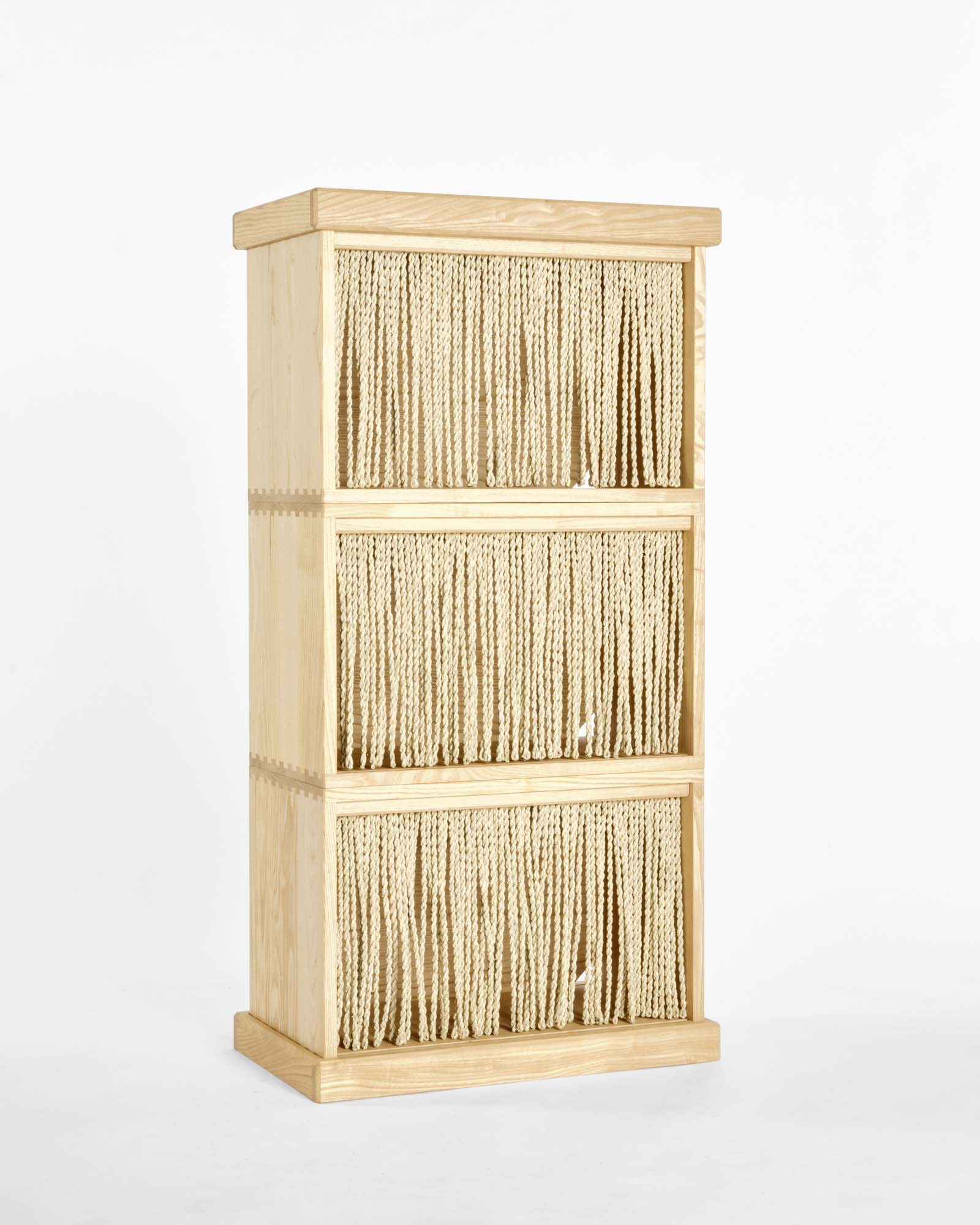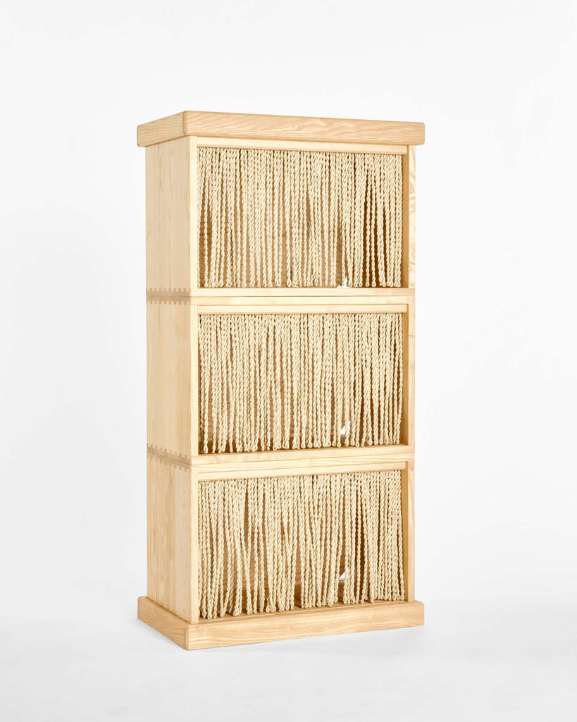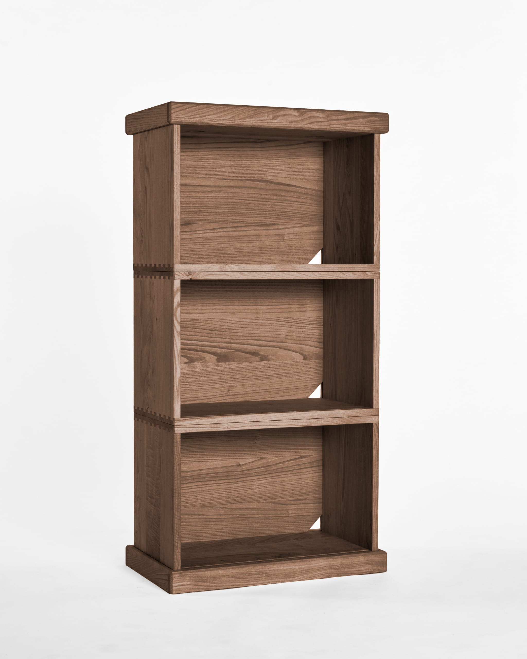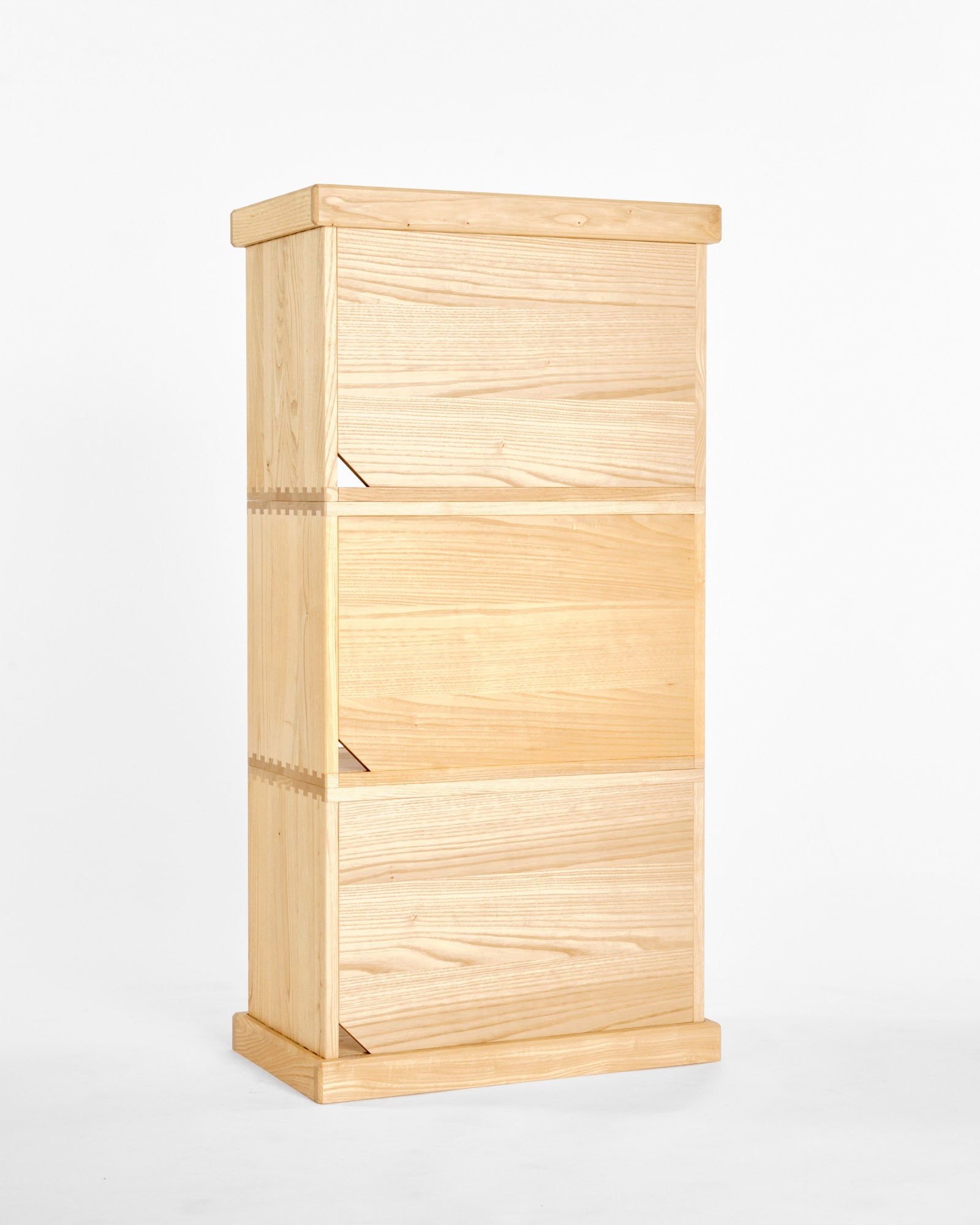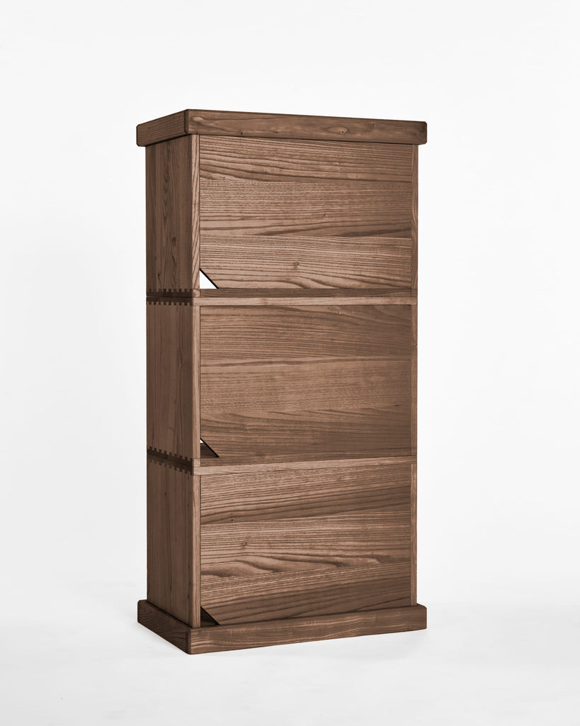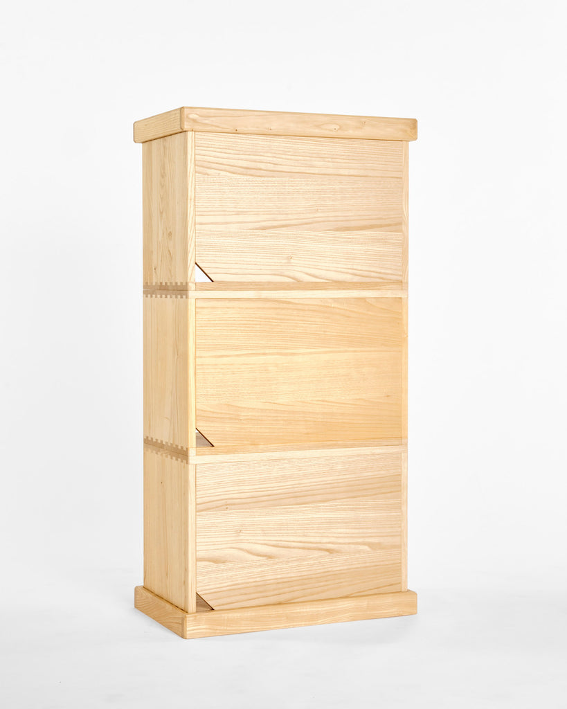 カリモク家具が培ってきた箱物製作の技術のひとつに、 「ダブテール手法」があります。「ダブテール (dovetail) 」とは、鳩の尾の形に似た「蟻ほぞ」と「あり穴」を組み合わせる伝統的な接合技法です。 一般的な家具では、こうした接合技術は製品の内側に施されるため、外からは見えないことがほとんどです。しかし、本プロジェクトではダブテールの美しさそのものをデザイン要素のひとつとして取り入れ、機能性と審美性を兼ね備えた仕上がりを追求しました。