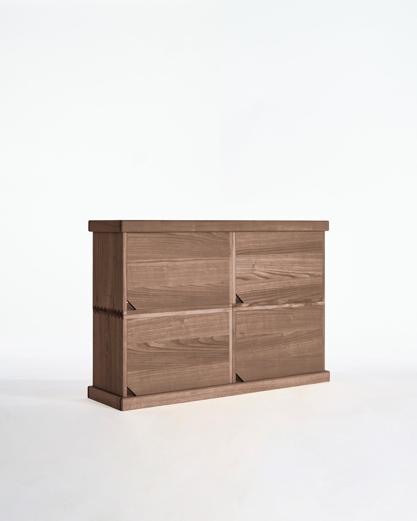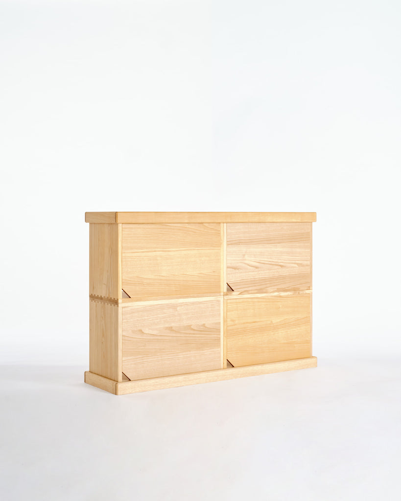カリモク家具が培ってきた箱物製作の技術のひとつに、 「ダブテール手法」があります。「ダブテール (dovetail) 」とは、鳩の尾の形に似た「蟻ほぞ」と「あり穴」を組み合わせる伝統的な接合技法です。 一般的な家具では、こうした接合技術は製品の内側に施されるため、外からは見えないことがほとんどです。しかし、本プロジェクトではダブテールの美しさそのものをデザイン要素のひとつとして取り入れ、機能性と審美性を兼ね備えた仕上がりを追求しました。