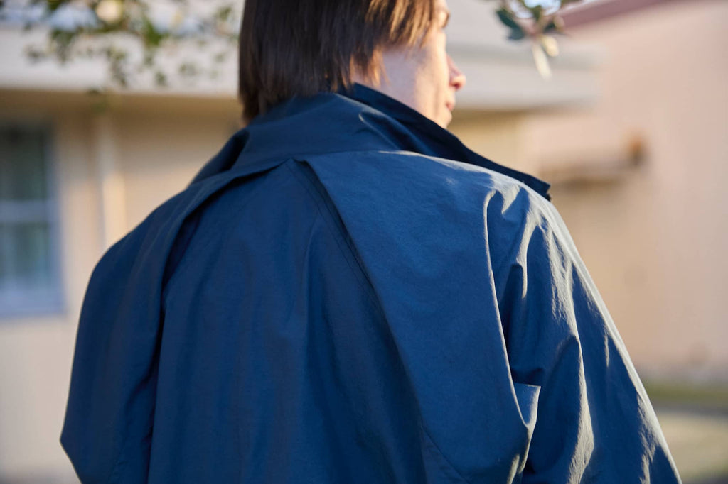 アウトドアウェアのように機能的で、シャツのようにさらっとした着心地です。やわらかく軽量な完全防水の生地で、それぞれ機能が異なる三層の生地が重なっています。外側はコットンの感触ですがタフで耐水性のあるナイロン、真ん中は風と水分をシャットアウトする細かい透過性の膜、内側は超軽量のメッシュで肌にしっとりなじみます。中にインナーダウンやセーターを着ることで、冬のアウターとしても活躍します。安全性にも配慮し、日本製でPFASフリー100%ナイロン生地を使用しています。