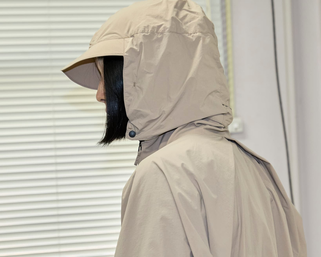 フードはアジャスターを絞ることで、視界を妨げない構造になっています。雨の日に自転車で走行中も、フードが脱げず、後方確認も安全に行えます。