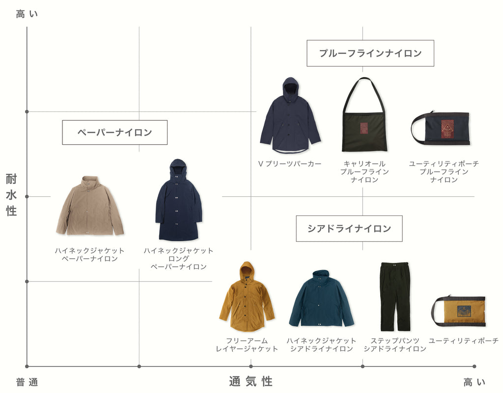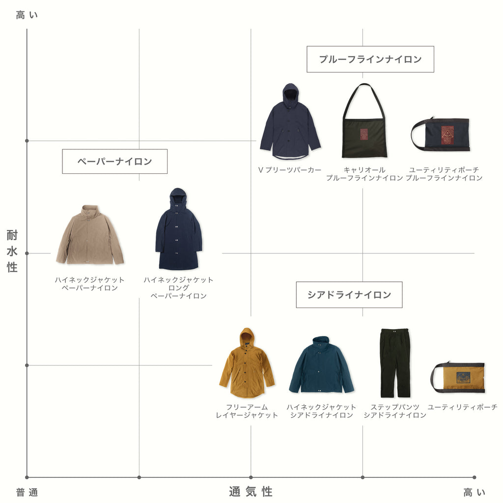 ポスタルコには雨を弾く、シアドライナイロン (撥水) 、ペーパーナイロン(防水)、プルーフラインナイロン (防水) のジャケットがあります。レインウェアに見えないデザインなので、タウンユースからアウトドアアクティビティまで幅広く対応、晴れの日でもサラッと着こなせます。雨を弾く構造なのでじめじめする梅雨の時期に最適です。ポスタルコオリジナルの日本製の生地です。