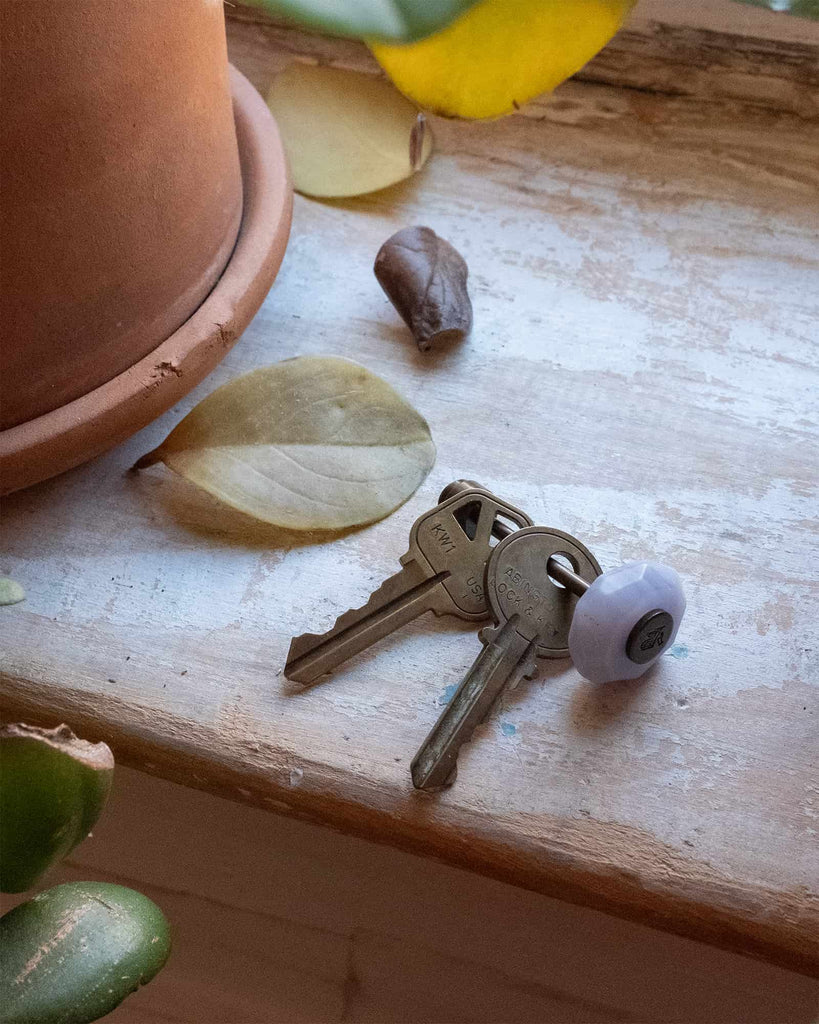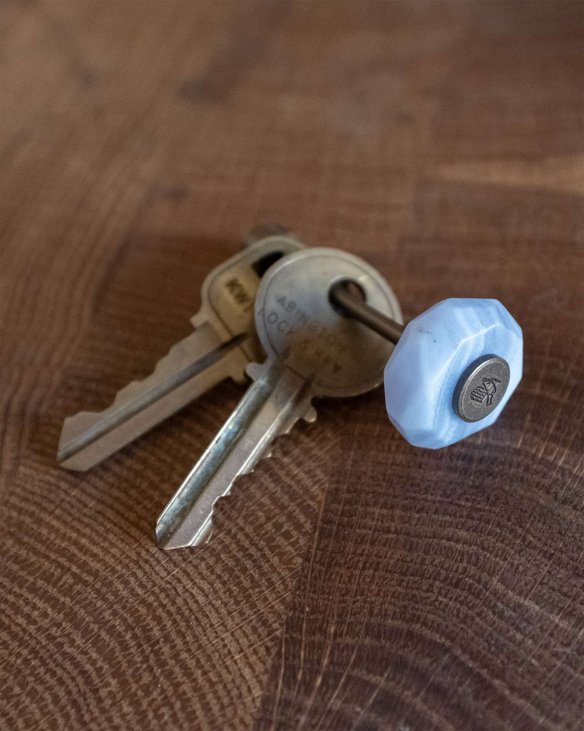 手とキーホルダーが、会話をしているような感覚です。このキーホルダーは鍵をしっかりとホールドし、ひんやりとした鉱石の感触を味わえます。鍵を気持ちよく持つ方法を模索して生まれたデザインです。