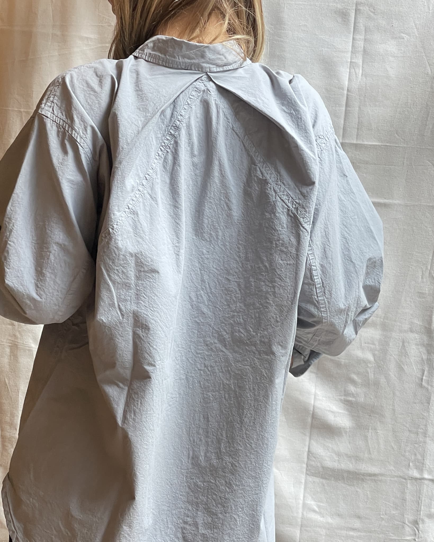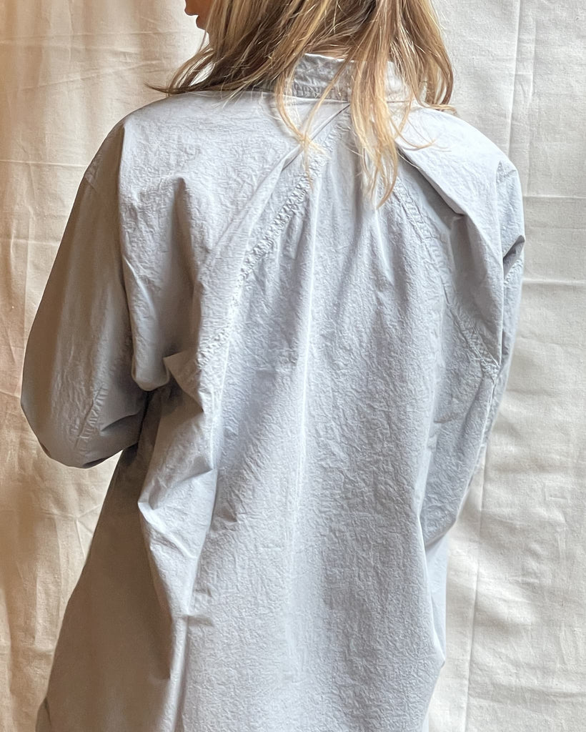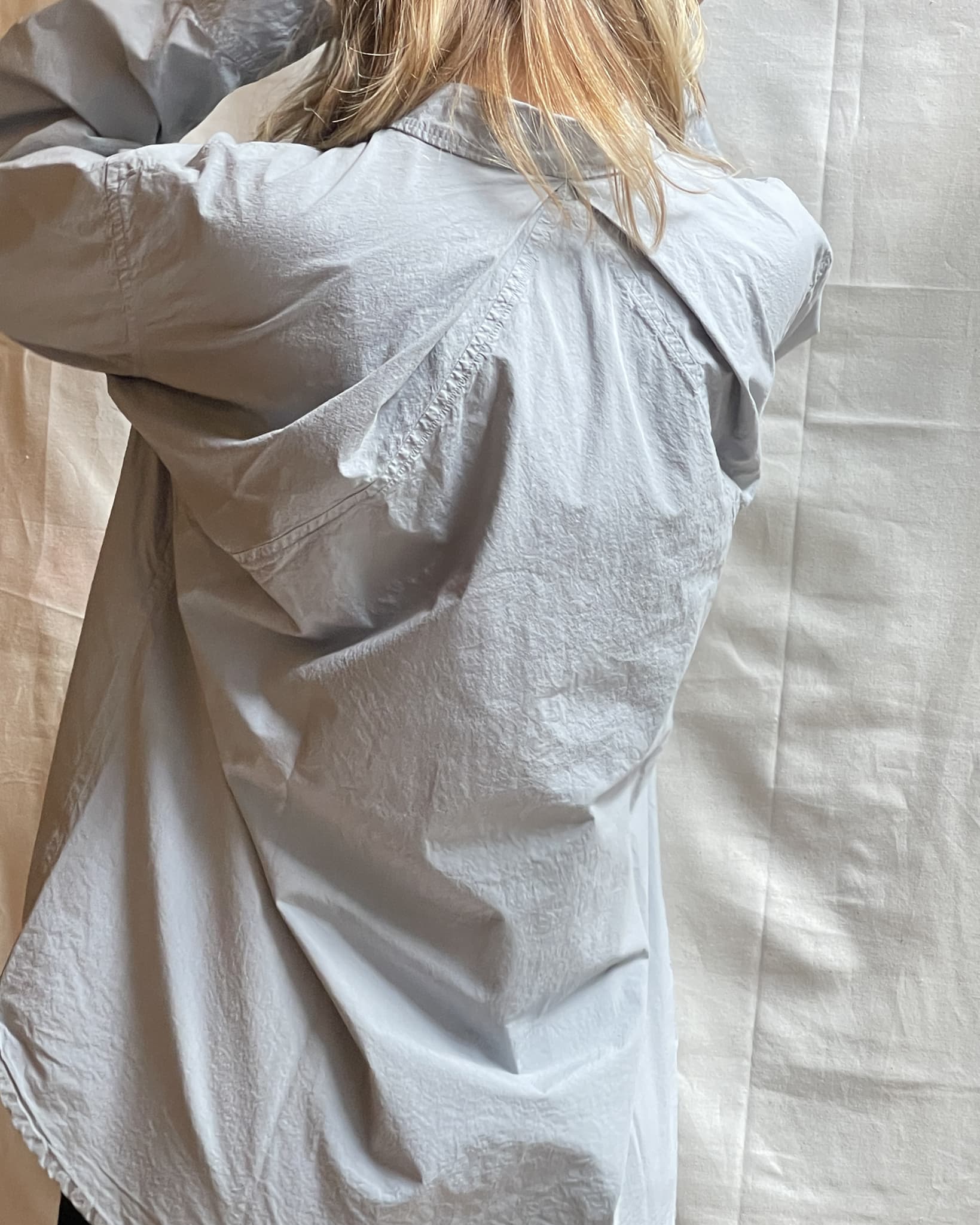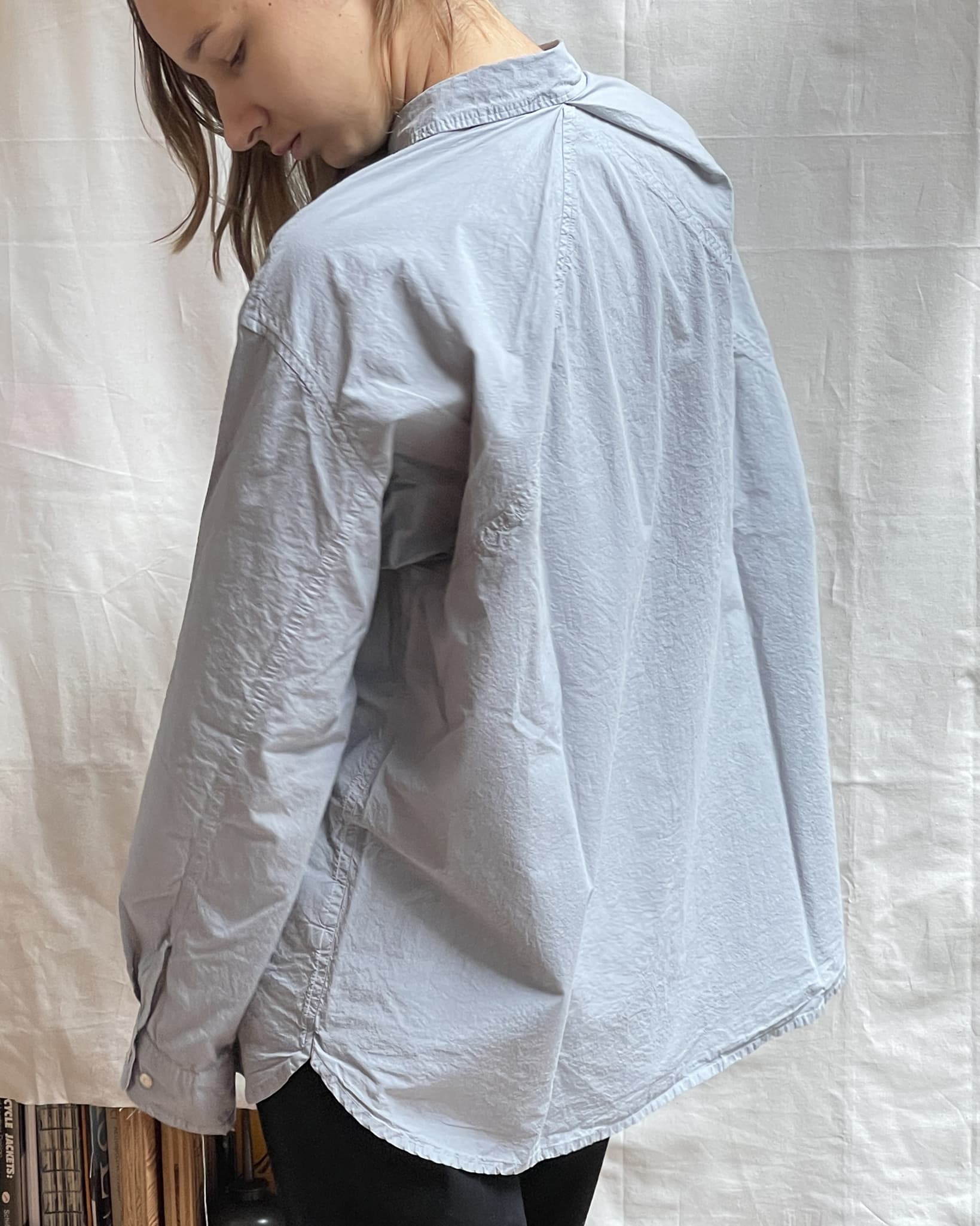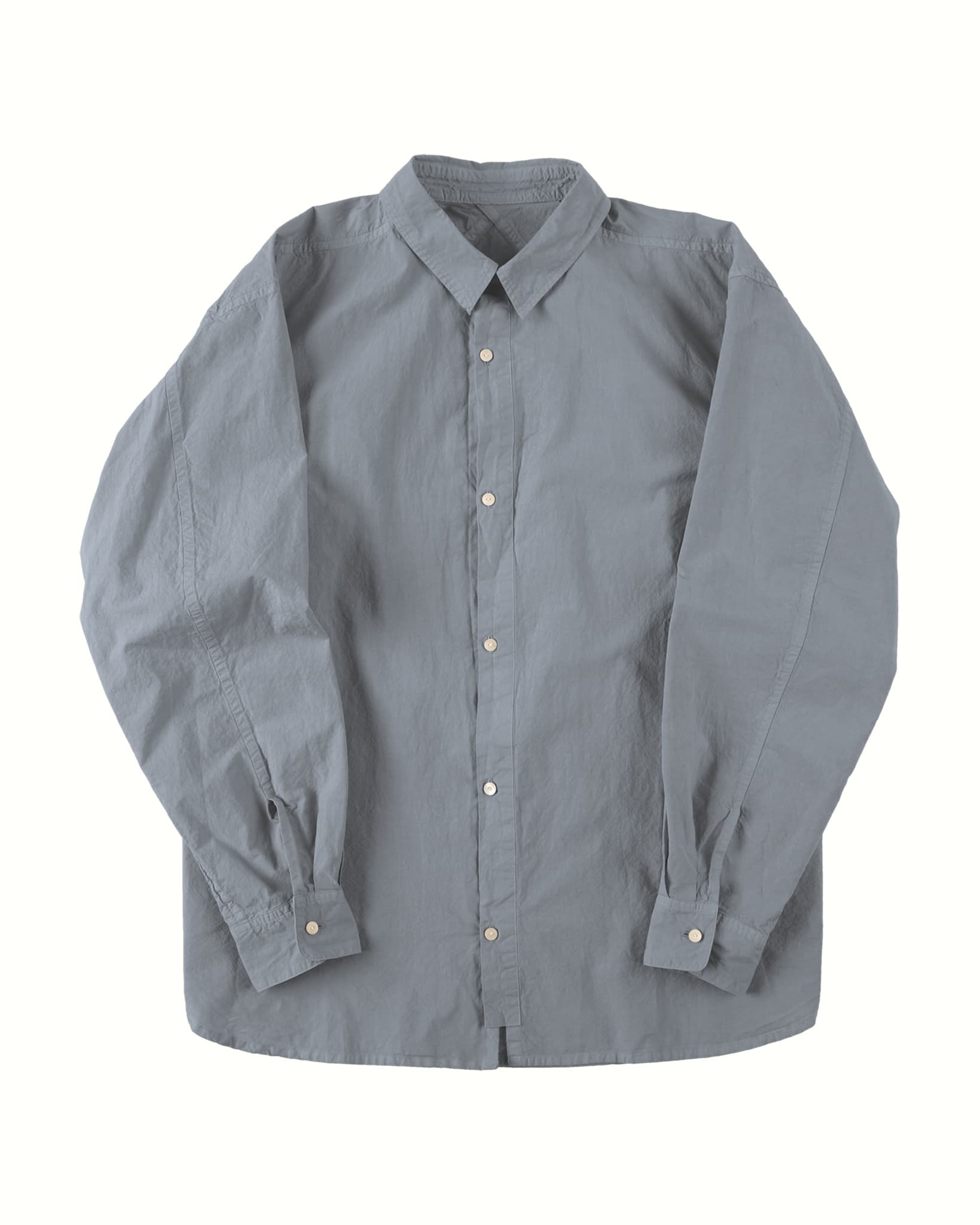 目の詰んだコットン素材なので、シャツのシルエットがきわだっています。染めによって、いっそう着心地がよく、着込んでいくと自然に馴染んでいきます。シャツをそのまま染めているため、洗濯による生地の縮みはあまりありません。