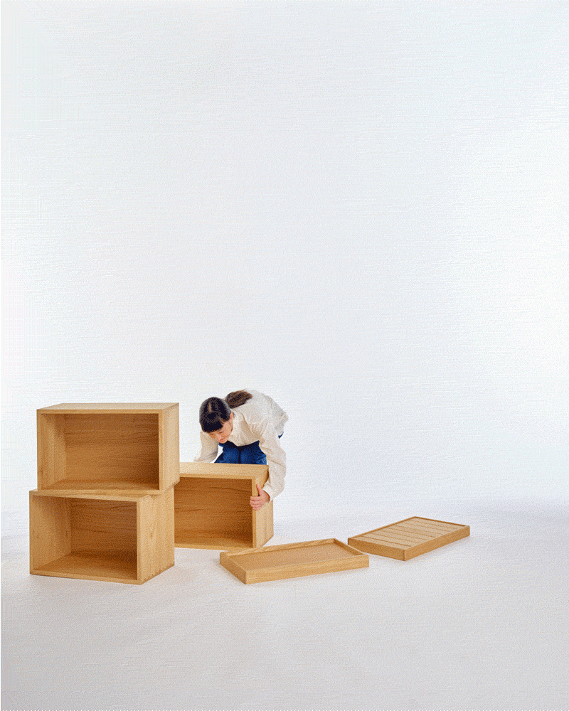 STAKKOのブロックシェルフは、無垢の栗材で作られた箱型のブロックと、安定性をもたらすトップとベースのトレイで構成されています。自宅やオフィスでの使用はもちろんのこと、店舗のディスプレイの棚としても活用することができます。ブロックは手回し可能なボルトで連結できるので、特別な工具が無くても簡単に組み立てることができます。日本製。