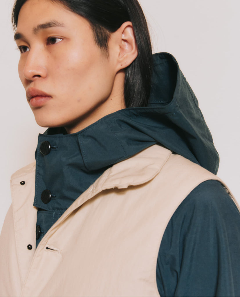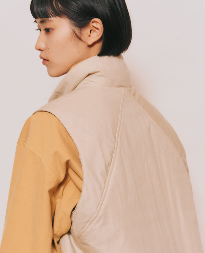 外出する時も、室内でもいろんなシーンで着ることができるベストです。中綿がウールだから、軽くて通気性があって温かいのです。高さのある襟がしっかり首を包み、熱を逃しやすい首元を温めます。着脱は、オリジナルのホーンボタン。格別の動きやすさと着心地です。