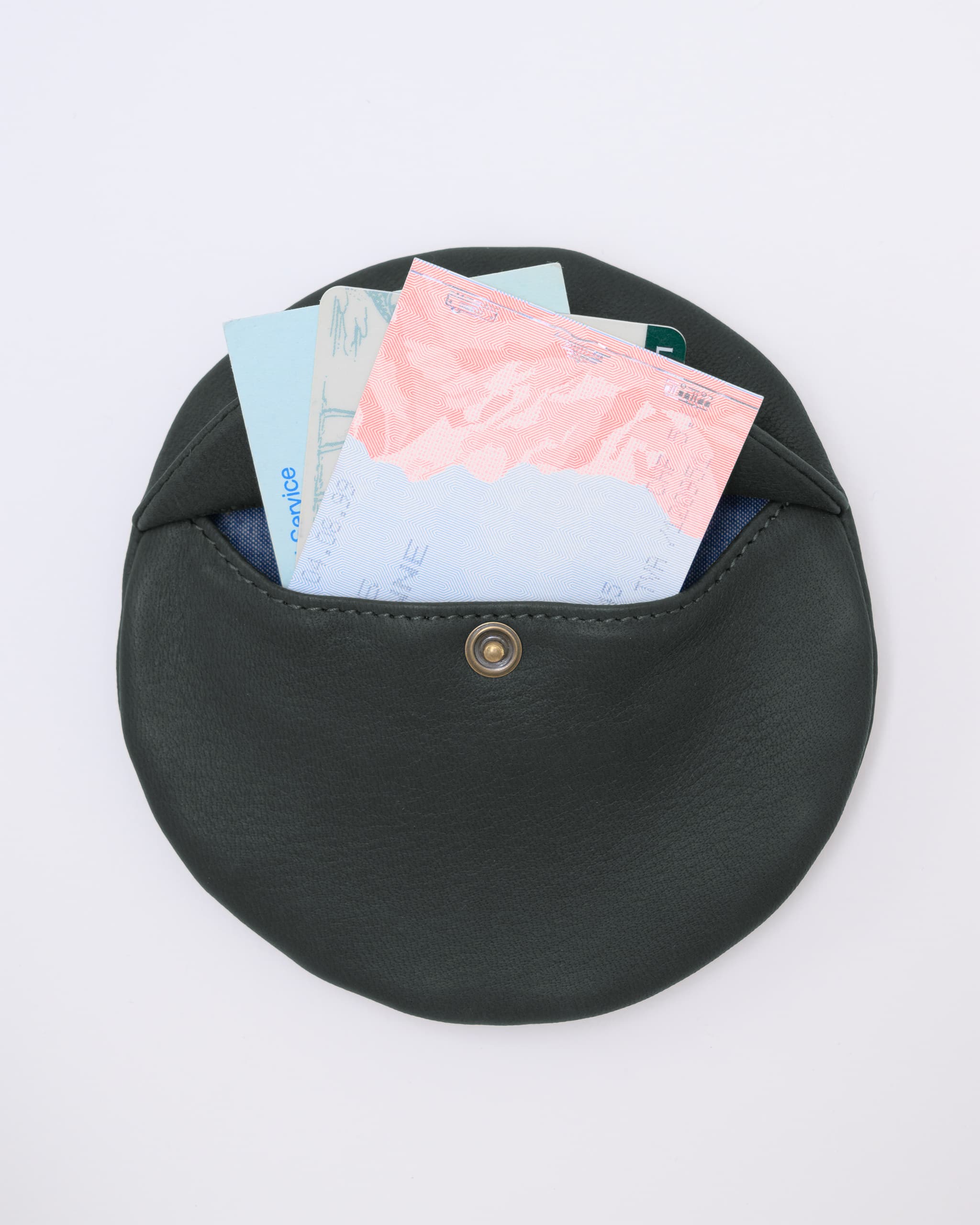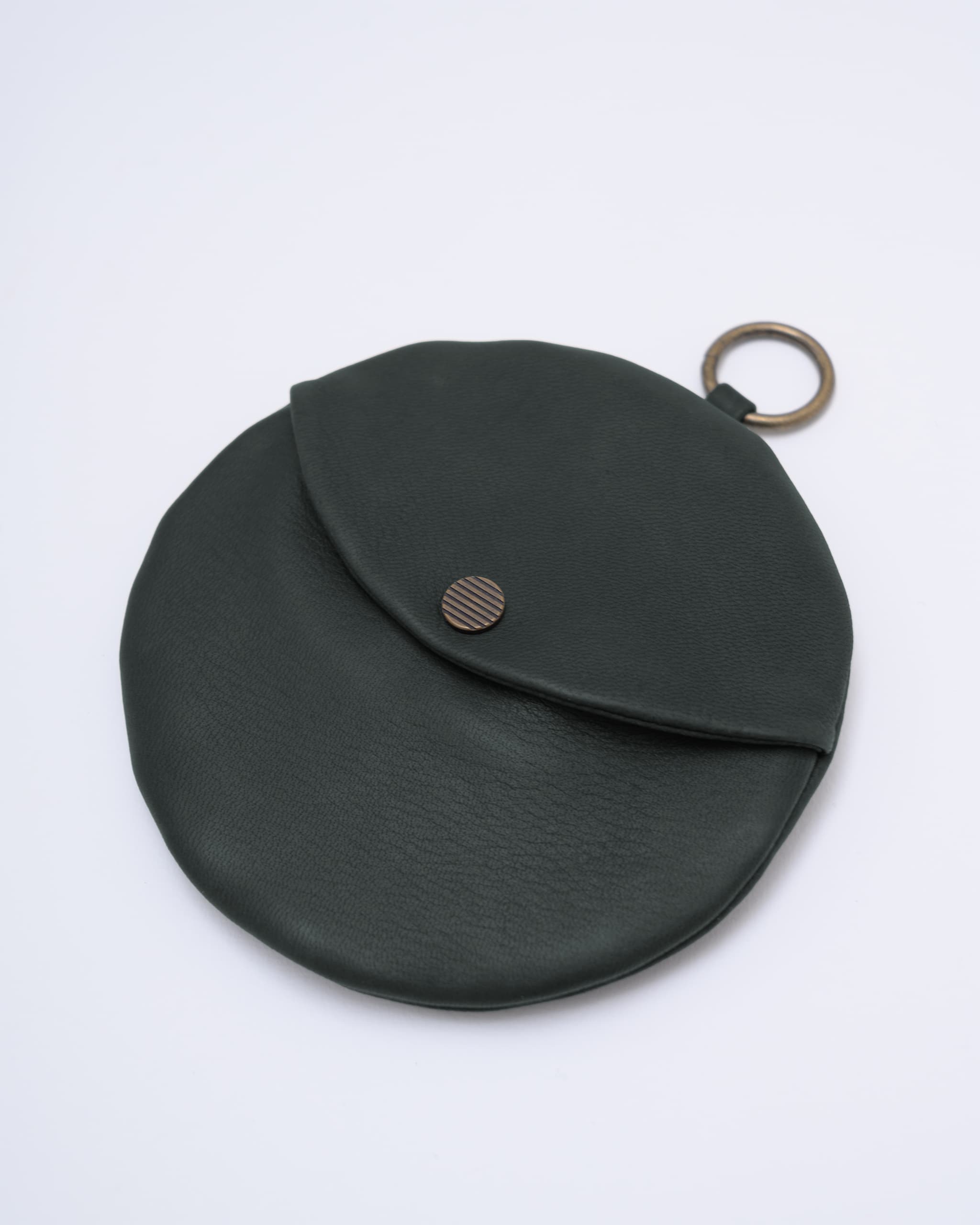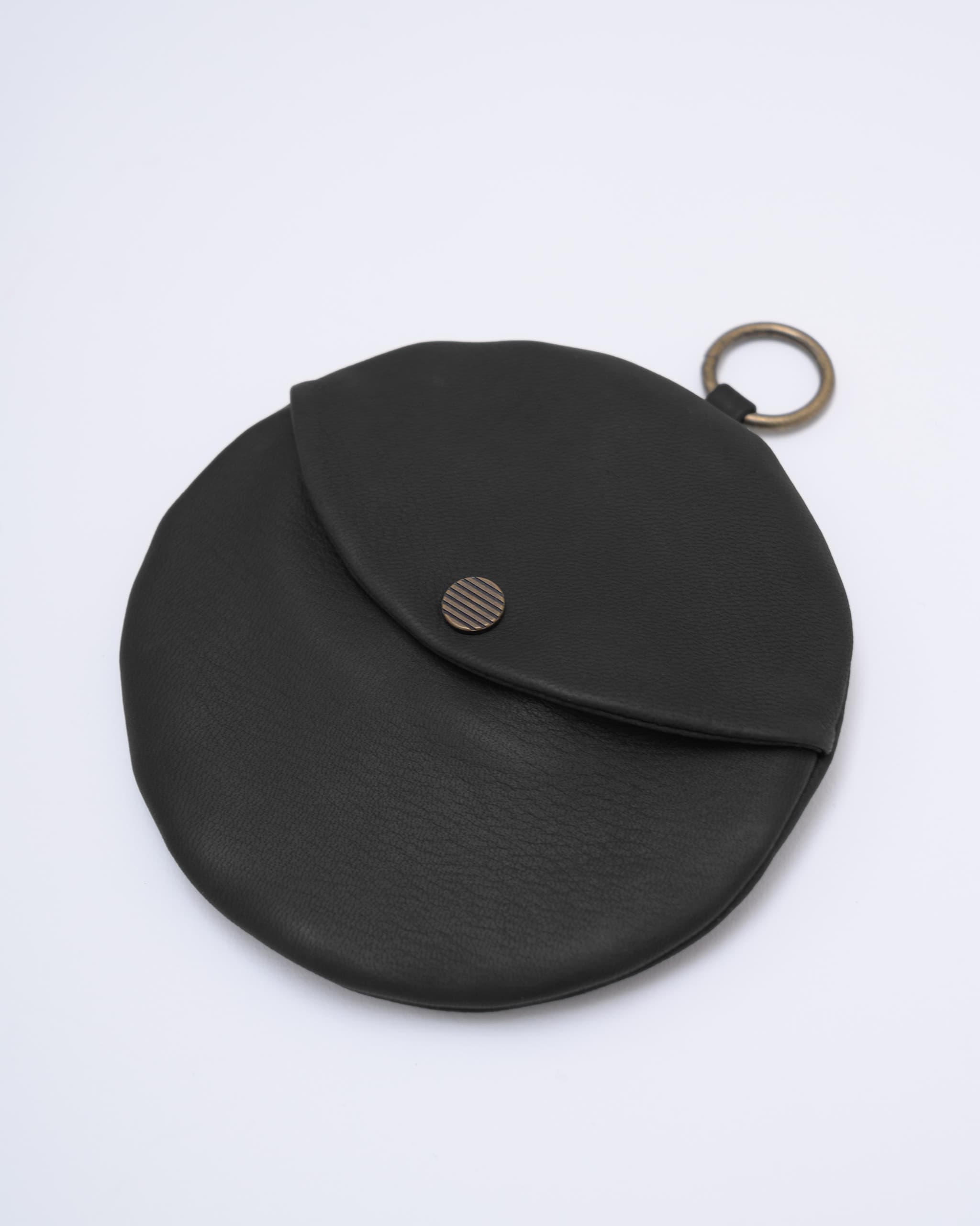 柔らかな素材の円型のウォレットです。カードや紙幣を入れるスナップポケット付き。反対側にはコイン入れのジッパーポケット。その内側には小さなキーリング。ポスタルコのペブルディアスキンとコットンシャンブレーの裏地。日本製。