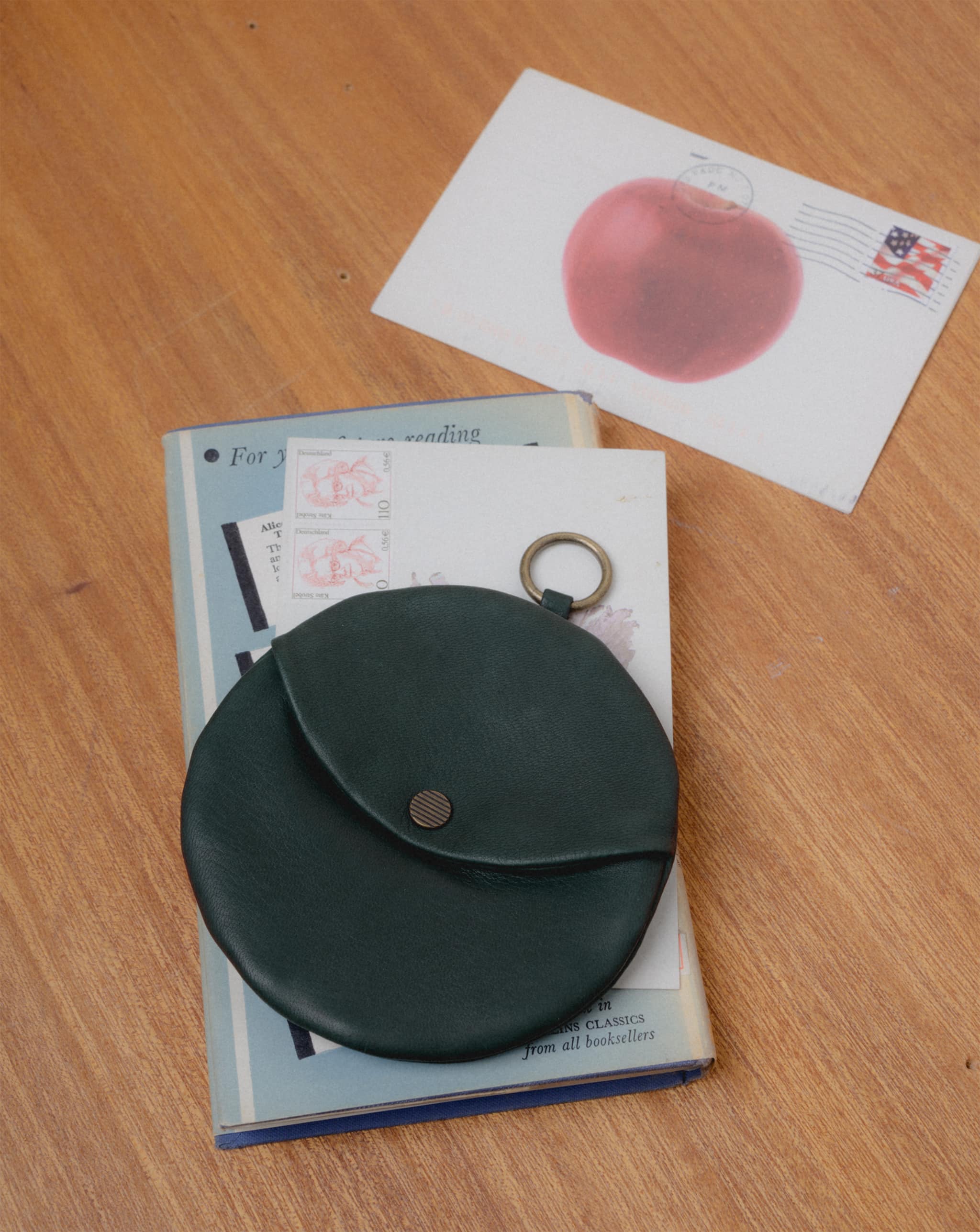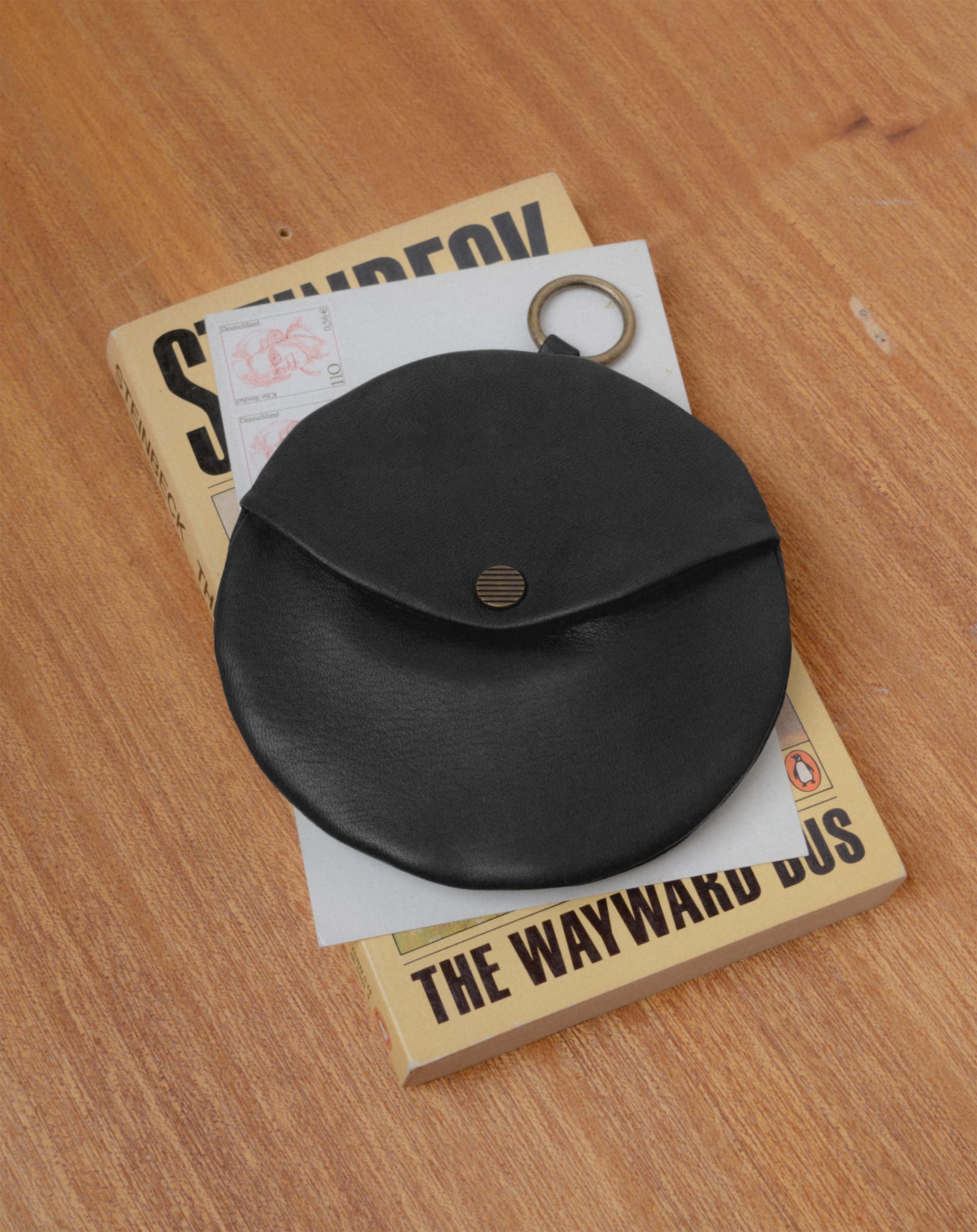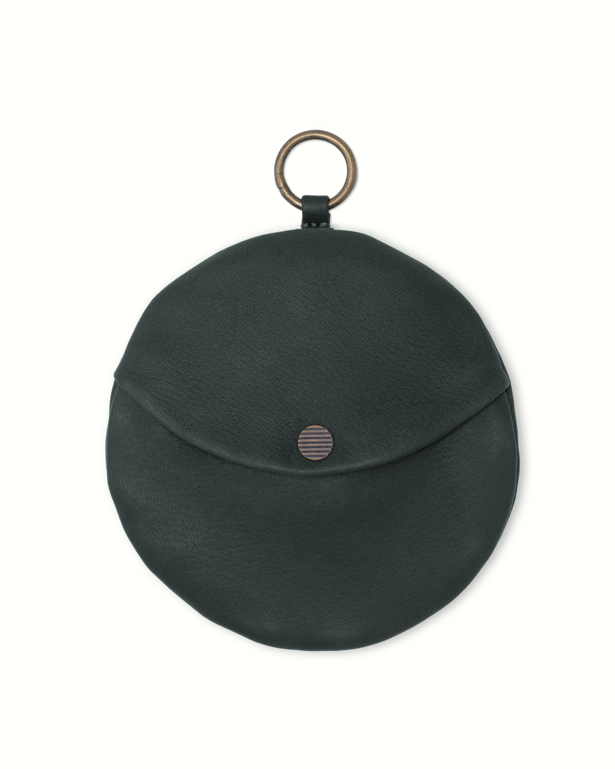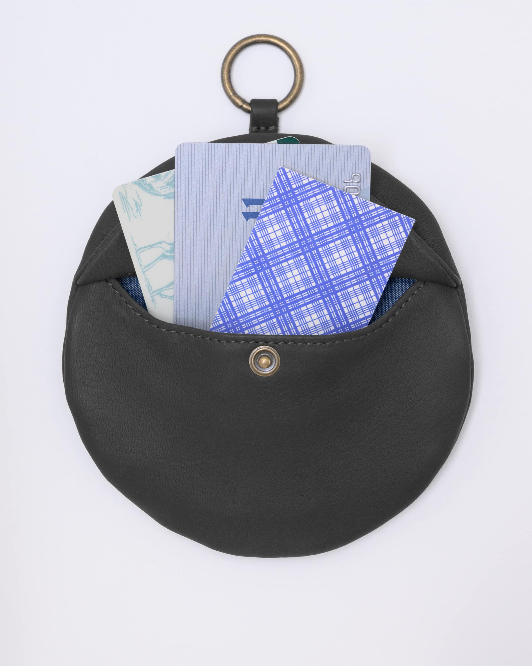 柔らかな素材の円型のウォレットです。カードや紙幣を入れるスナップポケット付き。反対側にはコイン入れのジッパーポケット。その内側には小さなキーリング。ポスタルコのペブルディアスキンとコットンシャンブレーの裏地。日本製。