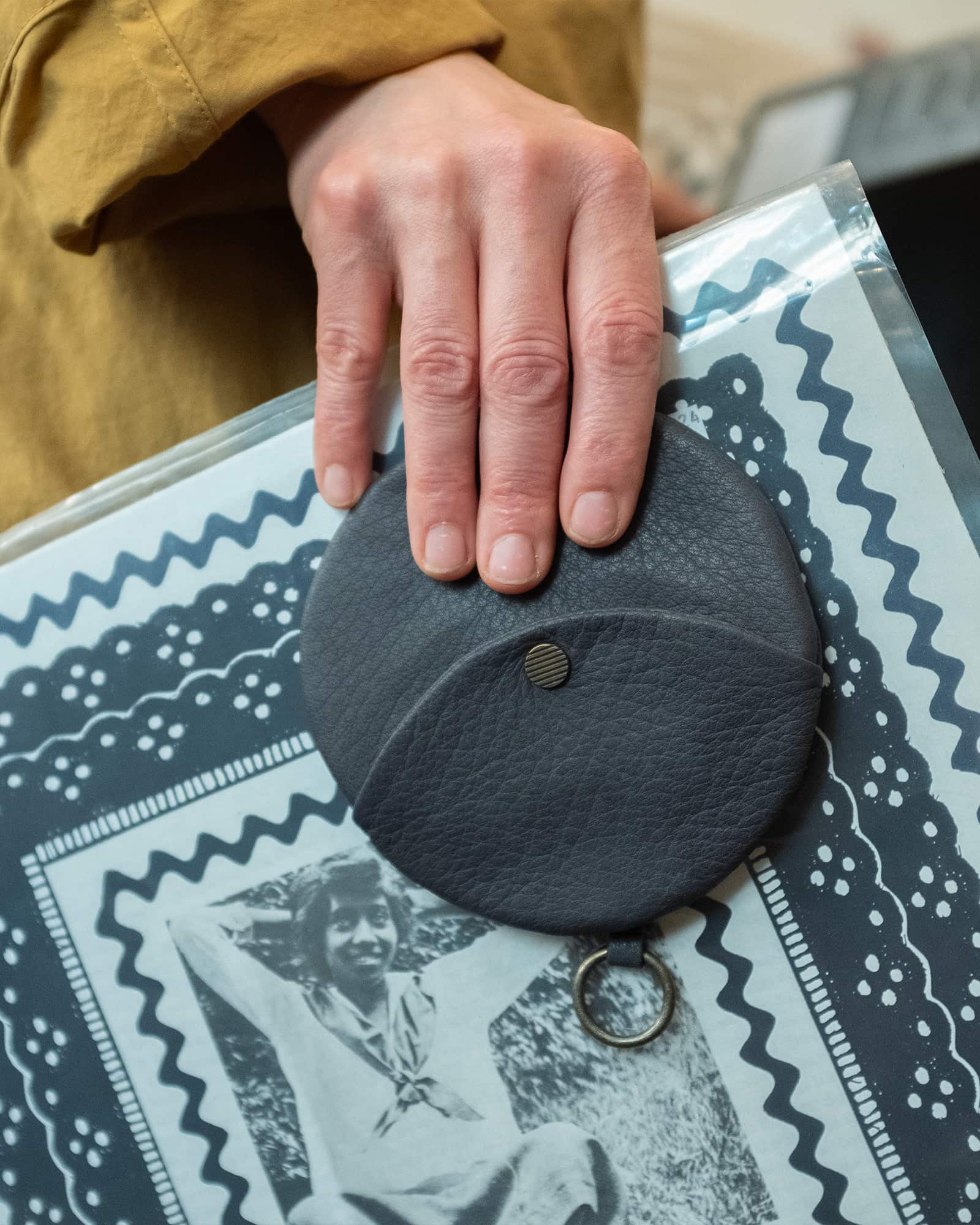 指紋をイメージしたポスタルコオリジナルの真鍮のスナップボタン。使い込む事で自然なツヤが生まれてきます。