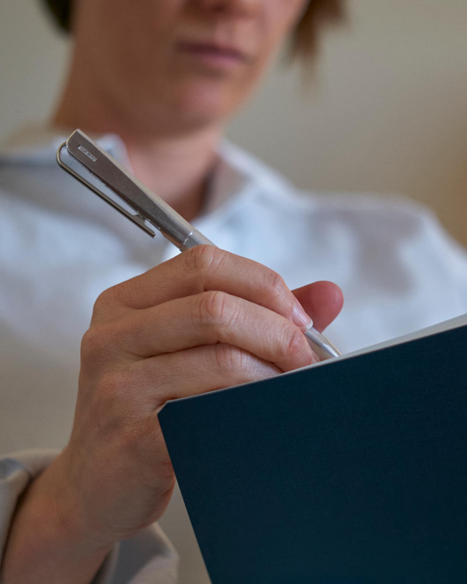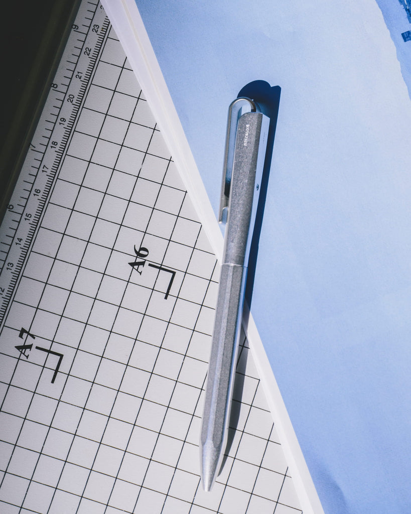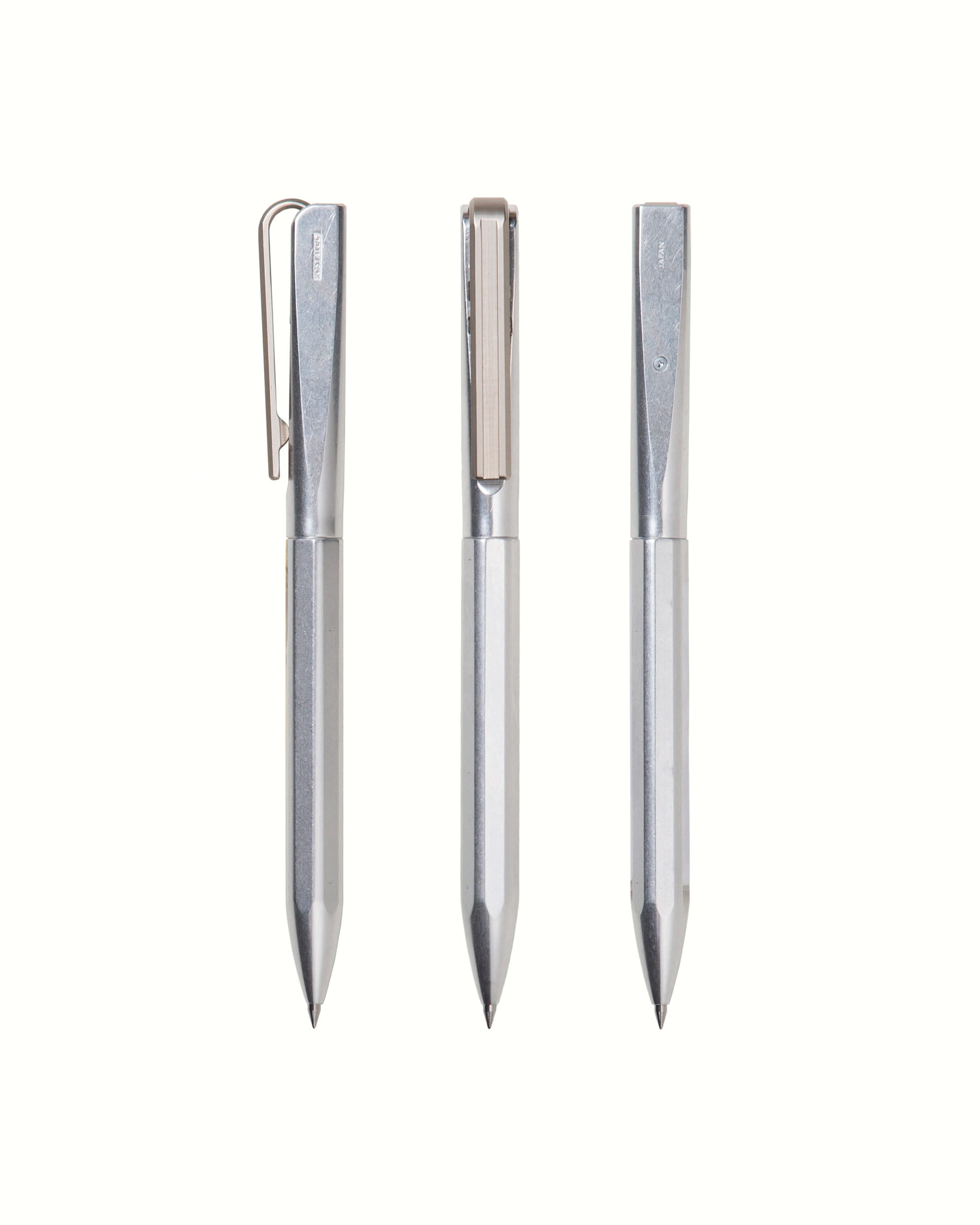ユニークなU字型のクリップを備えたチャンネルポイントペン。慣れ親しんだえんぴつのような六角形のグリップは、角が滑らかに仕上げられているので指にフィットします。無垢の金属からひとつひとつ手作業で削り出されたボールペンです。ボディはアルミニウム、クリップは真鍮の削り出しで、この組み合わせによって重さを感じさせずにしっかりとした書き心地を実現しています。