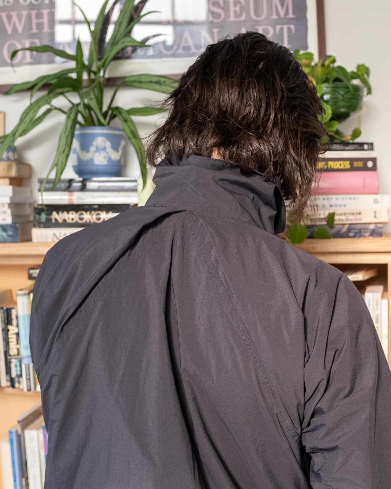 私たちが作りたかったのは、ゆったりとしたサイズ感であらゆる動きに対応でき、予測不可能な天候のなかでも身体をドライに保てるジャケットです。ソフトでしめつけないハイネックは、前を開けると折り返してオープンな着心地に。すぐに型崩れするストレッチ繊維は使用してません。そのため、より長くお使いいただけます。ウエストはドローコードで調節できます。ペーパーナイロンは、ポスタルコオリジナル仕様の生地。 耐水。防風。リサイクルナイロン100%。 男女兼用のリラックスシルエット。日本製。