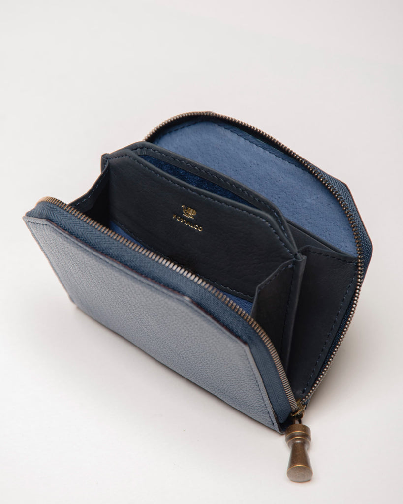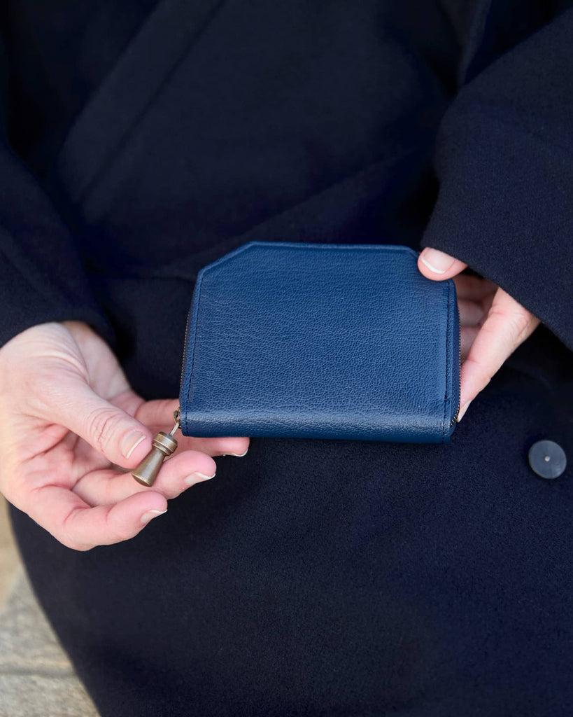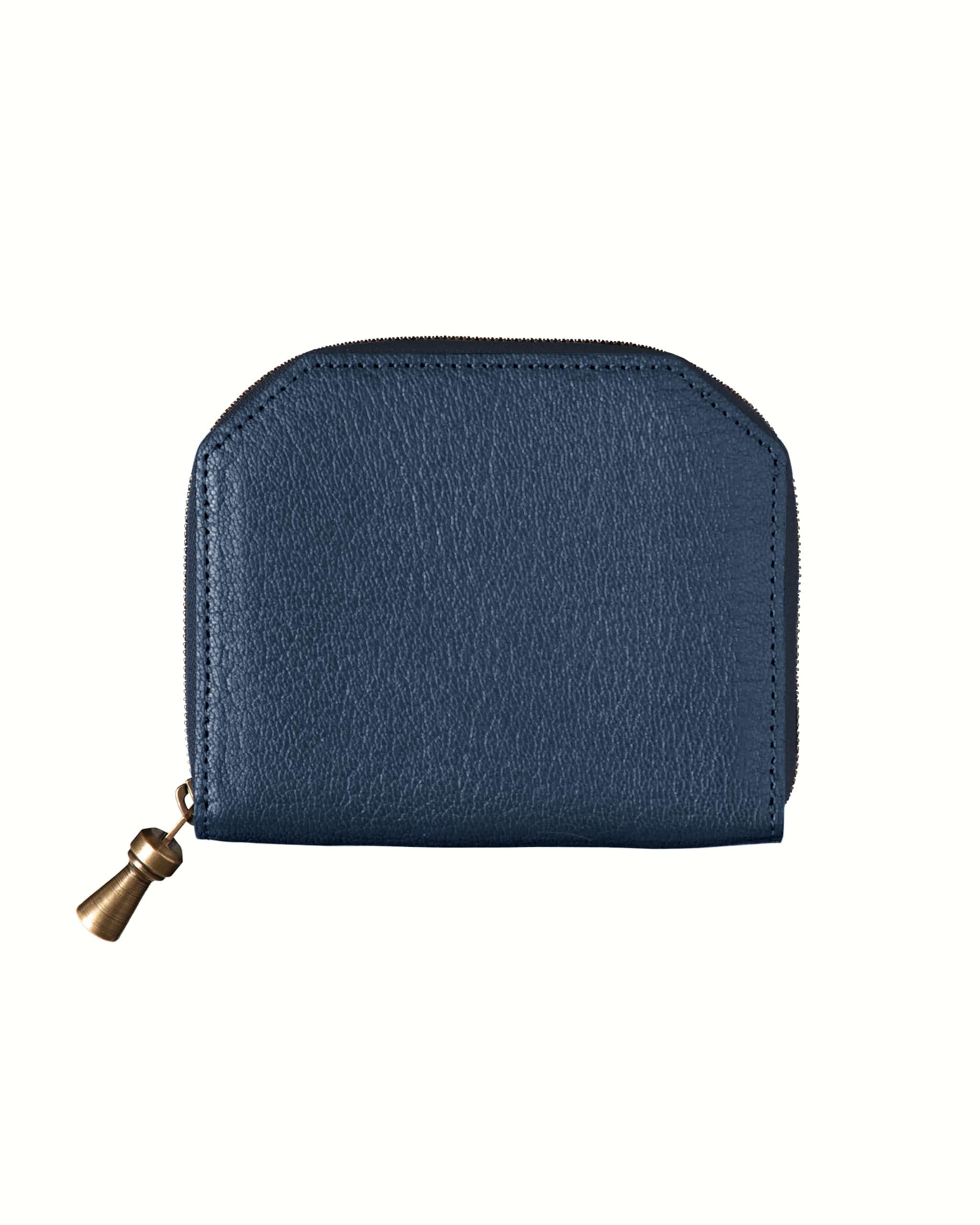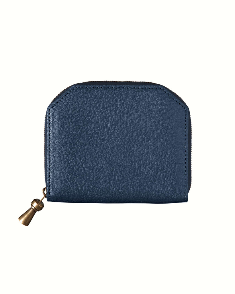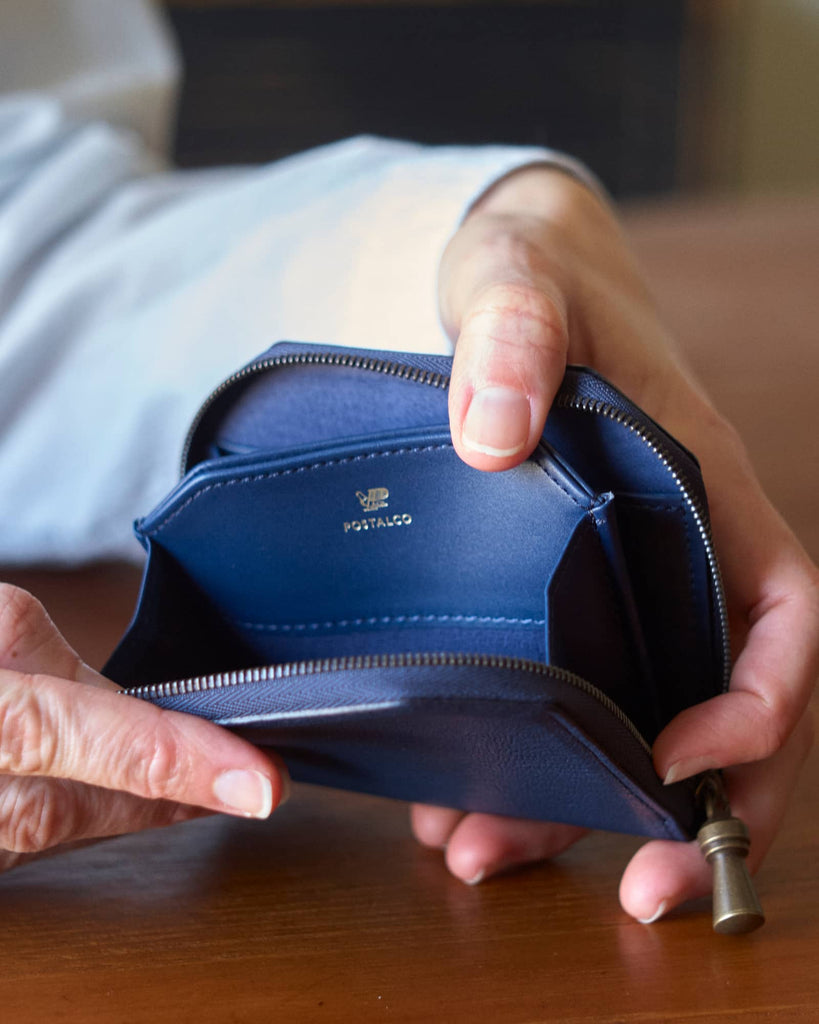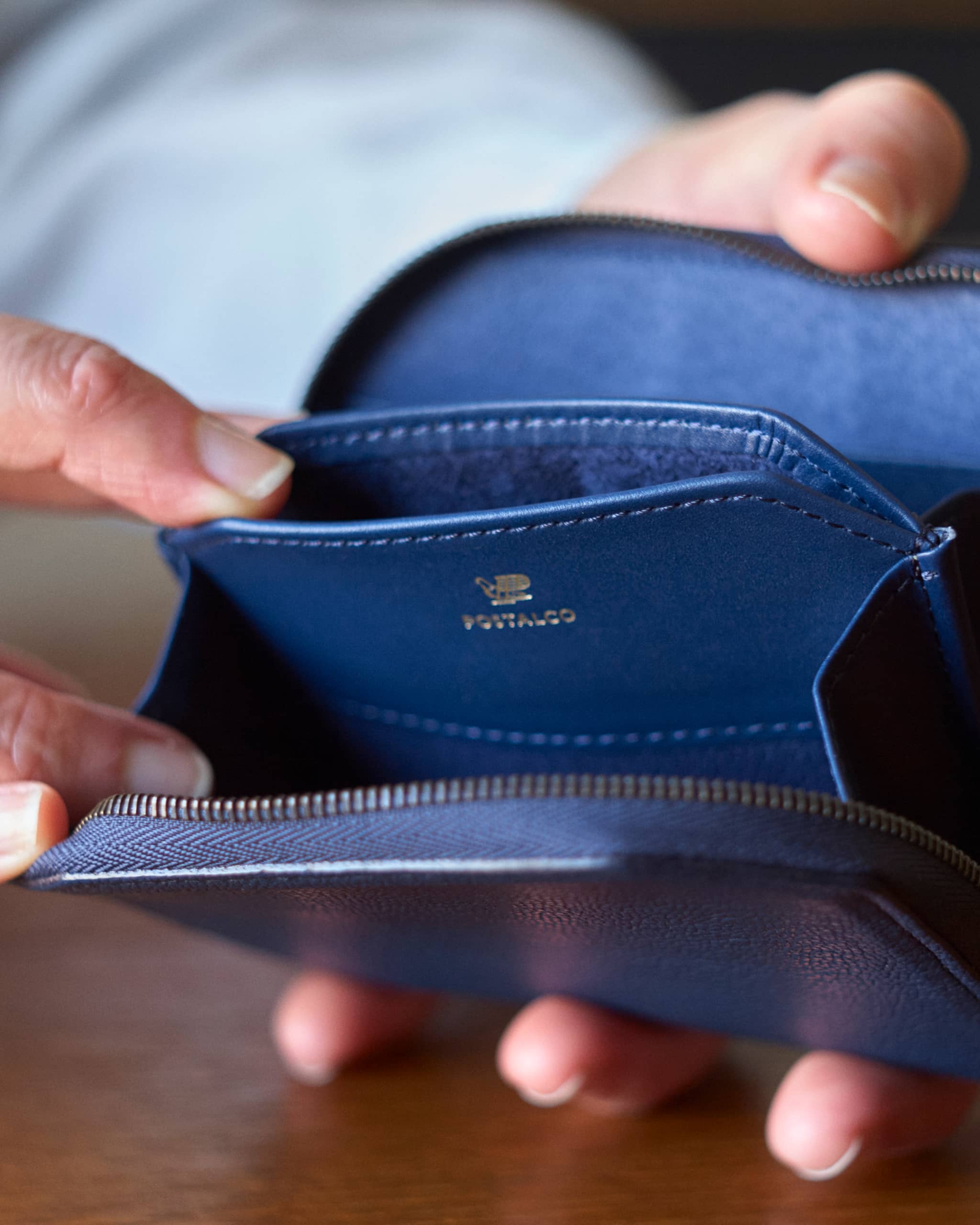 真ん中の背の高いポケットは、コインをいれてもこぼれ落ちないように工夫され、中身がすぐに取り出せます。また、底が少し浅く縫われているのでコインが取り出しやすくなっています。