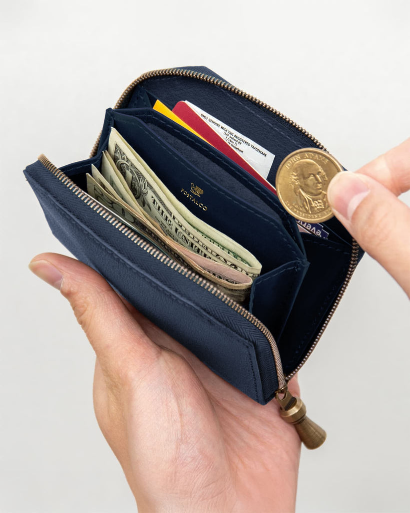 大きく広げることができる3つのポケットには、約10枚のカード、コイン、折りたたんだお札を入れることができます。日本製。