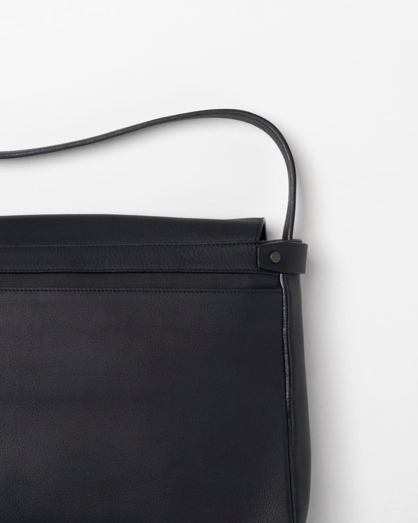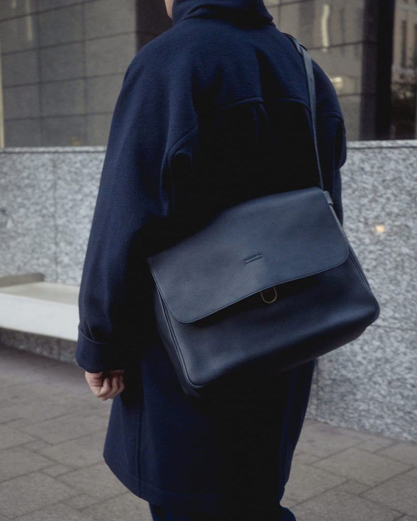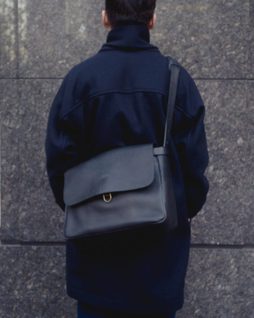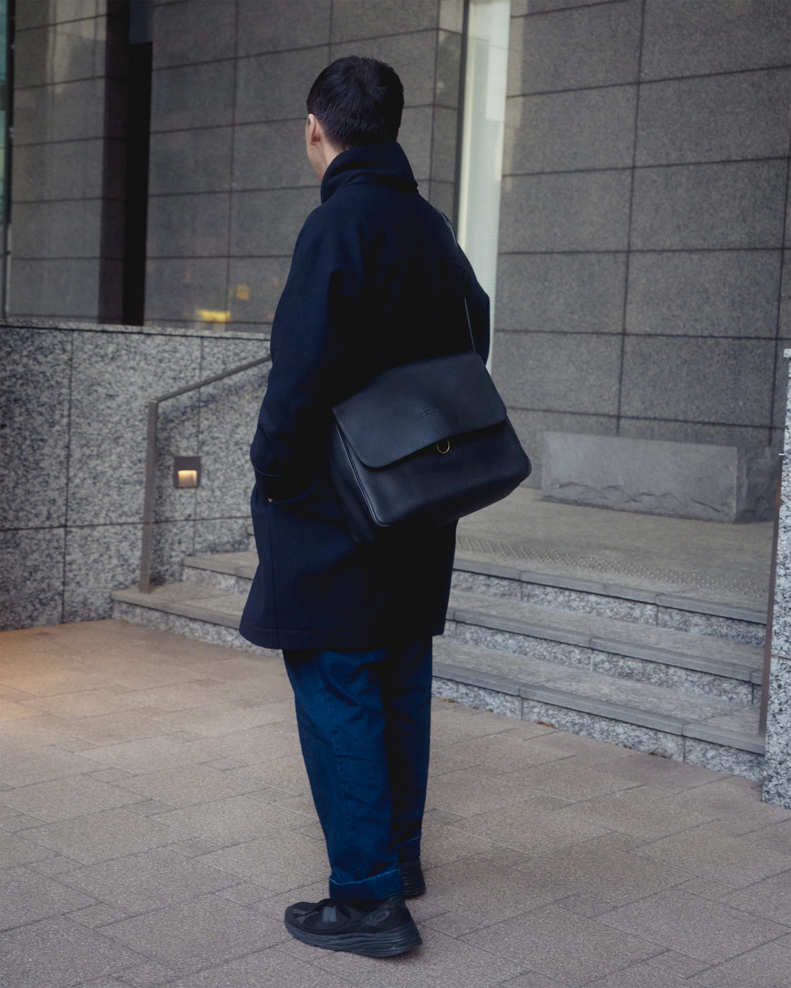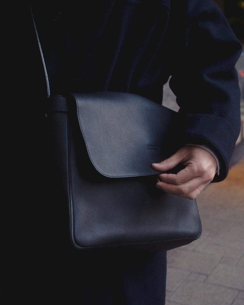 たいせつな手紙を配達してくれたポストマン。その肩にかかっていたのがメールバッグでした。前面と背面にオープンポケット。ミルレザーとピッグスキンの裏地。柔らかな手触りで、はじめから体にフィットします。A4サイズの書類がゆったり入り、16インチの Mac Book Pro も入れる事ができます。日本製。