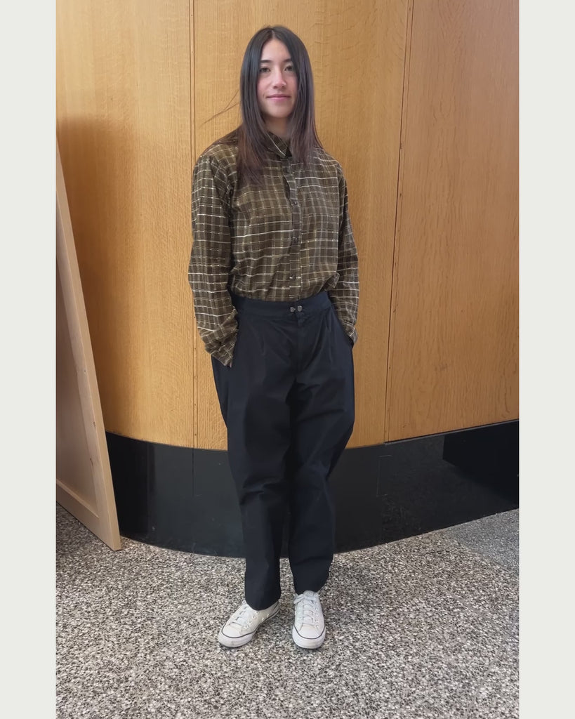 典型的なパンツは、大股で歩いたり自転車をこぐ時に足が後ろに引っ張られます。これではスムーズに足を動かすことができません。前に深めのタックを入れることで、まっすぐ立っている時には美しいドレープを描き、足を上げた時にはそのタックが広がるようにデザインしました。